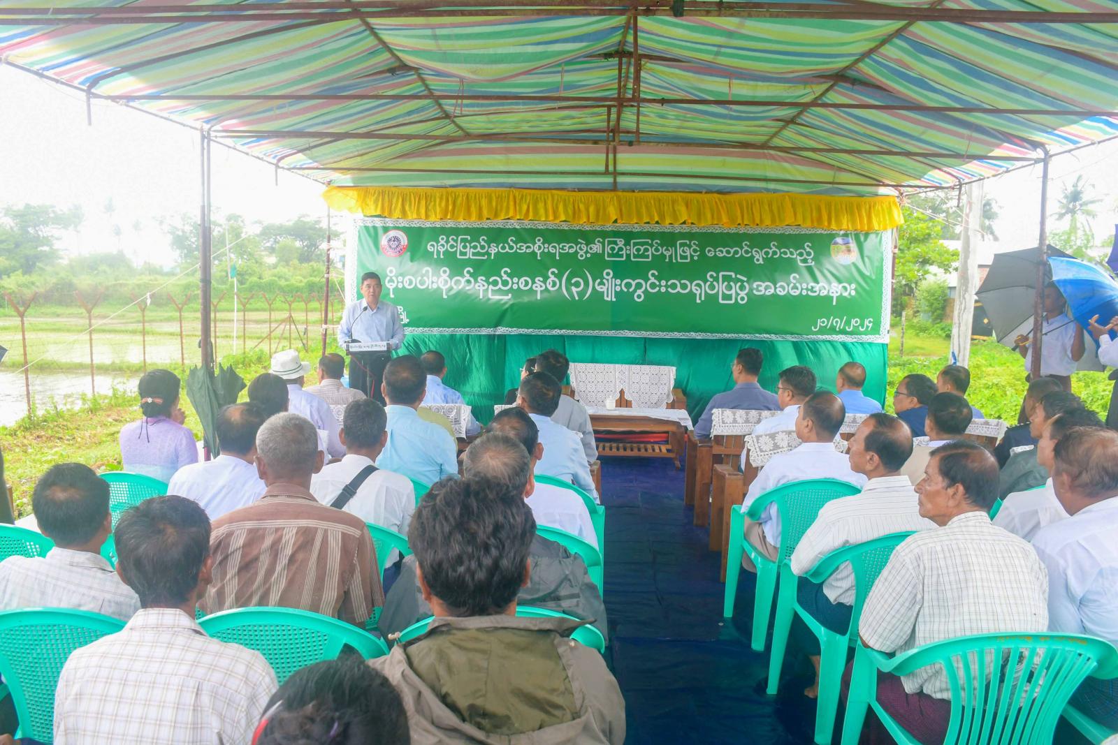 ဦးစွာ ရခိုင်ပြည်နယ်ဝန်ကြီးချုပ် ဦးထိန်လင်းက ရခိုင်ပြည်နယ်သည် မိုးများသည့်ဒေသဖြစ်သည့်အတွက် မိုးစပါးသီးနှံကို အဓိကထားစိုက်ပျိုးသော ပြည်နယ်တစ်ခုဖြစ်ကြောင်း၊ ၂၀၂၃-၂၀၂၄ ခုနှစ်တွင် မိုးစပါး၊ နွေစပါး စိုက်ပျိုးထုတ်လုပ်မှုအရ ပြည်နယ်၏ဒေသဝမ်းစာဖူလုံမှု ၁၄၃ ဒသမ ၈၂ ရာခိုင်နှုန်းရှိခဲ့ကြောင်း၊ ဒေသစားသုံးခြင်းထက် ပိုလျှံမှုများကို ပြည်နယ်ပြင်ပသို့ တင်ပို့ရောင်းချနိုင်ရန် ဈေးကွက်ယှဉ်ပြိုင်နိုင်ရန်အတွက် အရည်အသွေးပြည့်မီသည့် ထုတ်ကုန်များရရှိရေးလုပ်ငန်းသည်လည်း ဦးစားပေးဆောင်ရွက်သင့်သည့်လုပ်ငန်း တစ်ခုဖြစ်ကြောင်း၊ မိုးစပါးသီးနှံ စိုက်ဧကတိုးချဲ့ရန်အကန့် အသတ်များရှိနေသည့်အတွက် စိုက်ပျိုးသည့် ဧကများအပေါ် တစ်ဧကအထွက်နှုန်းတိုးတက်ရေး လုပ်ငန်းများကို ဆောင်ရွက်ရန် လိုအပ်မည်ဖြစ်ကြောင်း၊ တစ်ဧကအထွက်နှုန်းတိုးတက်ရန်အတွက် စိုက်ပျိုးသည့်သီးနှံများအလိုက် ပန်းတိုင်အထွက်နှုန်းများ သတ်မှတ်ဆောင်ရွက်လျက်ရှိရာ မိုးစပါးသီးနှံ ပန်းတိုင်အထွက်နှုန်း တစ်ဧကလျှင် တင်း(၁၀၀)နှင့်အထက် ထွက်ရှိရန် ရည်မှန်းဆောင်ရွက်လျက်ရှိကြောင်း၊ ပန်းတိုင်းအထွက်နှုန်း ရရှိရေးအတွက် ဒေသရေမြေရာသီဥတုနှင့် ကိုက်ညီသည့် မျိုးကောင်းမျိုးသန့် မျိုးစေ့များသုံးစွဲခြင်း၊ ကောင်းမွန်သည့် စိုက်ပျိုးနည်းစနစ်များ ရွေးချယ် ကျင့်သုံးခြင်း၊ ဓာတ်မြေ ဩဇာများကို သဘာဝမြေဩဇာများနှင့်စနစ်တကျ ရောစပ်သုံးစွဲခြင်းများကို စိုက်ပျိုးရေးဦးစီးဌာနမှ နည်းပညာပေးသည့်အတိုင်း လိုက်နာဆောင်ရွက်ကြရမည်ဖြစ်သကဲ့သို့ မြေပြုပြင် ထွန်ယက်ရေး၊ ရိတ်သိမ်းခြွေလှေ့ရေးများအတွက် စက်မှုလယ်ယာဦးစီးဌာနနှင့် ချိတ်ဆက်ဆောင်ရွက်သွားရ မည်ဖြစ်ကြောင်း၊ ယနေ့အခမ်းအနားတွင် မိုးစပါးကို ကောက်စိုက်စက်ဖြင့်စိုက်ပျိုးခြင်း၊ မျိုးစေ့ချကိရိယာဖြင့် စိုက်ပျိုးခြင်း၊ ကြိုးတန်းဖြင့်အတန်းလိုက်စိုက်ပျိုးခြင်း၊ နည်းစနစ်များကို တောင်သူများလက်တွေ့ လေ့လာနိုင် စေရန် ပညာပေးပြသဆောင်ရွက်သွားမည်ဖြစ်ကြောင်းနှင့် တောင်သူများအနေနဖြင့် စိုက်ပျိုးနည်းစနစ်များအလိုက် ဆောင်ရွက်ရမည့်နည်းလမ်းများ၊ လိုက်နာရမည့်အချက်များ၊ ရှောင်ရန် အချက်များ၊ ကုန်ကျစရိတ်နှင့် အကျိုးအမြတ်များကို လေ့လာပြီး မိမိတို့စိုက်ပျိုးမည့် လယ်မြေများနှင့် ကိုက်ညီသည့် အကျိုးရှိနိုင်မည့် လုပ်ငန်းများကိုရွေးချယ်၍ လိုက်နာကျင့်သုံးရန်လိုအပ်မည်ဖြစ်ကြောင်း၊ သို့မှသာ အထွက်နှုန်းကောင်း၍ အရည်အသွေးပြည့်မီသော ထွက်ကုန်များရရှိလာပြီး ပြည်နယ်တွင်း ဖူလုံရုံသာမက ပြည်နယ်ပြင်ပသို့ တင်ပို့ရောင်းချခြင်း၊ ပြည်ပနိုင်ငံများသို့ တင်ပို့နိုင်ခြင်းဖြင့် တောင်သူများ