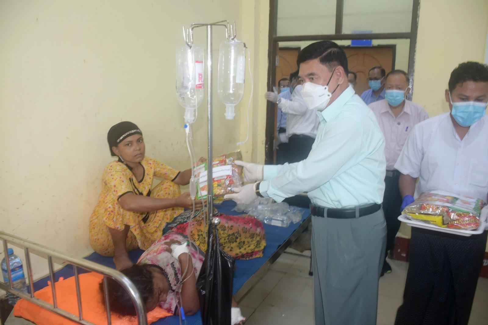ထို့နောက် ပြည်နယ်ဝန်ကြီးချုပ်နှင့်အဖွဲ့သည် စစ်တွေမြို့နယ်၊ သက္ကယ်ပြင်တိုက်နယ်ဆေးရုံသို့ သွားရောက်ပြီး ဆေးရုံတက်ရောက် ဆေးကုသမှုခံယူနေကြသော လူနာများအား လှည့်လည်ကြည့်ရှုအားပေးကာ လိုအပ်သည်များကို ကျန်းမာရေးဝန်ထမ်းနှင့် တာဝန်ရှိသူများအား ပေါင်းစပ်ညှိနှိုင်းပေးသည်။ ဆက်လက်၍ ပြည်နယ်ဝန်ကြီးချုပ်နှင့်အဖွဲ့သည် ဆေးကုသမှုခံယူနေကြသော လူနာများအား အာဟာရဖြည့်စွက်စာများနှင့် စားသောက်ဖွယ်ရာများကို ထောက်ပံ့ပေးအပ်ပြီး ကျန်းမာရေးဝန်ထမ်းများအား စားသောက်ဖွယ်ရာများကို ပေးအပ်ခဲ့ကြသည်။