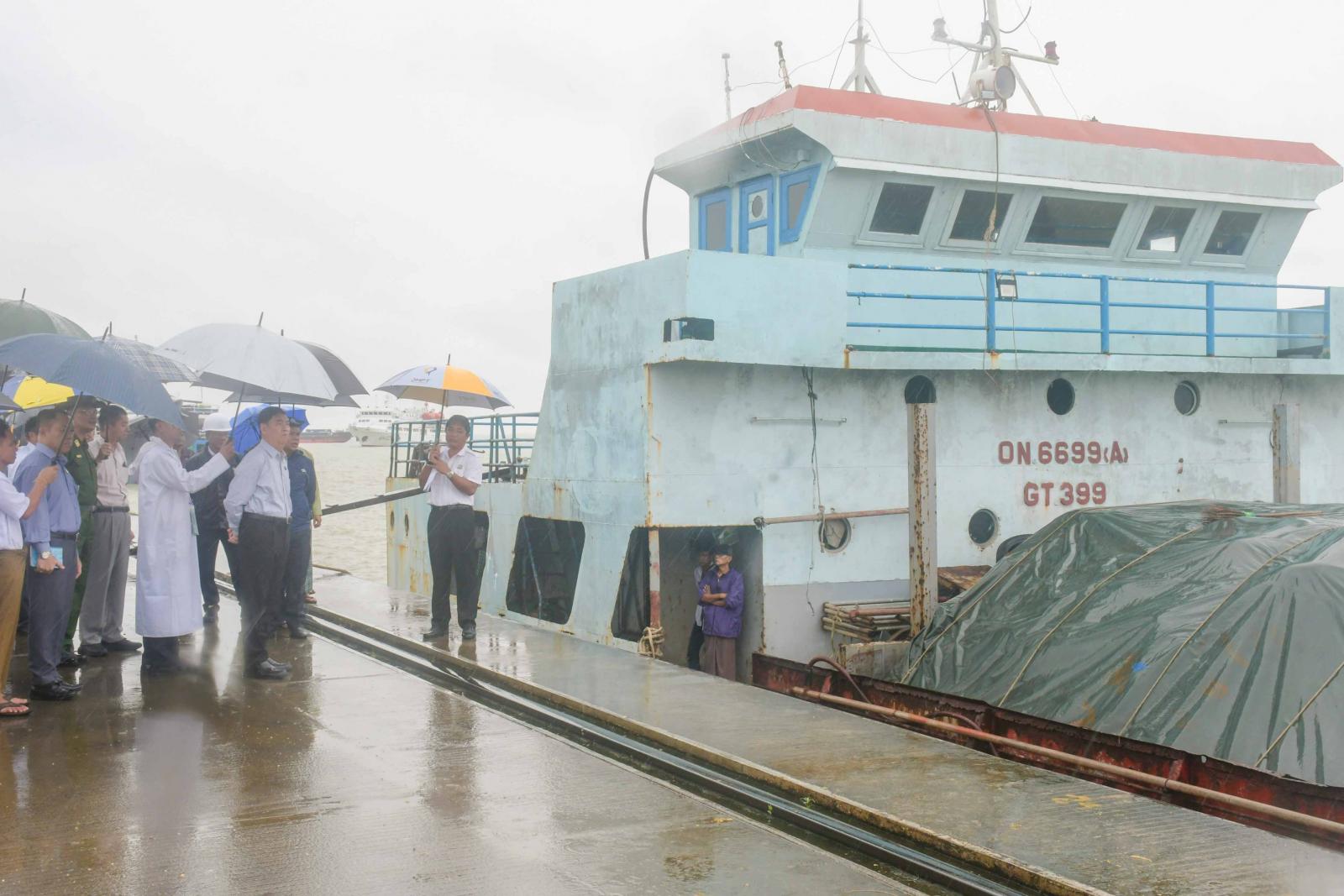 ဆက်လက်၍ ပြည်နယ်ဝန်ကြီးချုပ်နှင့်အဖွဲ့သည် အဆိုပါဆိပ်ကမ်း၌ အမ်ဗွီ-ရွှေသုဝဏ်နှင့် အမ်ဗွီ- အောင်ရတနာ သင်္ဘောတို့မှ ဆန်နှင့်စားသောက်ကုန်ပစ္စည်းများအား အတင်အချပြုလုပ်နေမှုကို သွားရောက်ကြည့်ရှုစစ်ဆေးကြပြီး လိုအပ်သည်များကို တာဝန်ရှိသူများနှင့် ပေါင်းစပ်ညှိနှိုင်းပေးခဲ့သည်။