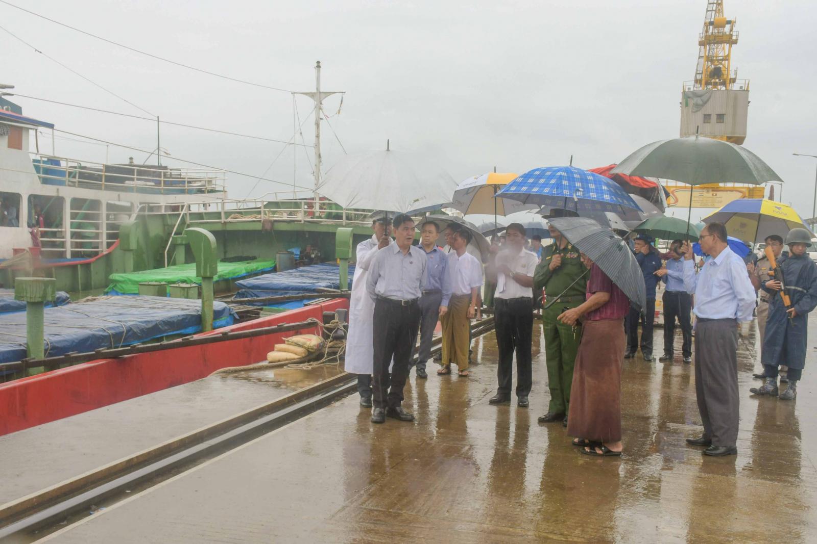 အဆိုပါပစ္စည်းများအား ကုန်တင်ကုန်ချ ပြုလုပ်နိုင်ရေး ရခိုင်ပြည်နယ်ဝန်ကြီးချုပ် ဦးထိန်လင်းနှင့် တာဝန်ရှိသူများက သွားရောက်ကြည့်ရှု စစ်ဆေးကြပြီး ပြည်နယ်ဝန်ကြီးချုပ်က ရောက်ရှိလာသောကုန်ပစ္စည်းများအား မိုးလေဝါသအခြေအနေအပေါ်မူတည်ပြီး စနစ်တကျအတင်အချပြုလုပ်နိုင်ရေး၊ ကုန်ပစ္စည်းများပျက်စီးဆုံးရှုံးမှု မဖြစ်စေရေးနှင့် ဘေးအန္တရာယ်ကင်းရှင်းစွာ ဆောင်ရွက်နိုင်ရေးတို့ကိုမှာ ကြားပြီး လိုအပ်သည်များကို တာဝန်ရှိသူများနှင့် ပေါင်းစပ်ညှိနှိုင်းပေးခဲ့သည်။