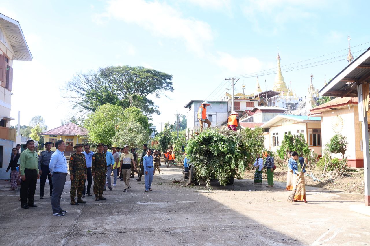 ထို့နောက် ရွှေတောင်ပရိယတ္တိစာသင်တိုက်နှင့် အမှတ် (၇) အခြေခံပညာအထက်တန်း ကျောင်းဝန်းအတွင်း ဥပဓိရုပ်ကောင်းမွန်စေရေးနှင့် သန့်ရှင်းသာယာလှပမှုရှိစေရေးအတွက် တပ်မတော်သားများ၊ မြန်မာနိုင်ငံရဲတပ်ဖွဲ့ဝင်များ၊ မီးသတ်တပ်ဖွဲ့ဝင်များနှင့် ဌာနဆိုင်ရာ ဝန်ထမ်းများက စုပေါင်းသန့်ရှင်းရေး ကုသိုလ်ပြုဆောင်ရွက်ပေးနေမှုများကို ကြည့်ရှုအားပေးခဲ့ပြီး ရွှေတောင်ပရိယတ္တိစာသင်တိုက်အတွင်း အကြမ်းဖက်သောင်းကျန်းသူများလုပ်ရပ်ကြောင့် ပျက်စီးခဲ့သည့် သာသနိကအဆောက်အဦများကိုကြည့်ရှု၍ အမြန်ဆုံးပြုပြင် မွမ်းမံဆောင်ရွက်နိုင်ရေး တာဝန်ရှိသူများအား မှာကြားခဲ့သည်။