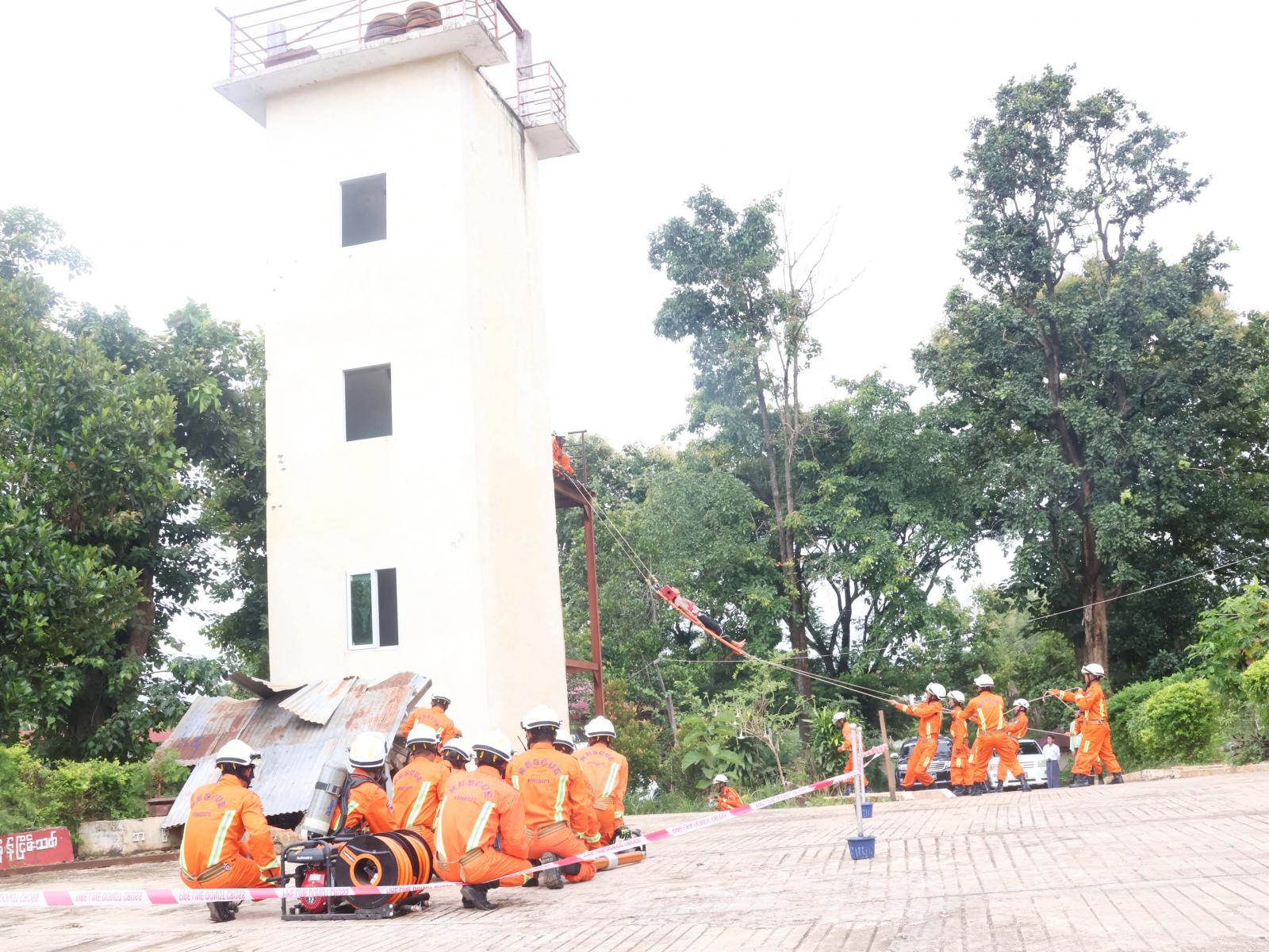 ရှေးဦးစွာ ပြည်နယ်ဝန်ကြီးချုပ်နှင့် တာဝန်ရှိသူများသည် ကယားပြည်နယ်မီးသတ်ဦးစီးမှူးရုံး၌ ငလျင်ဘေးအန္တရာယ်သဏ္ဌာန်တူ ဇာတ်တိုက်လေ့ကျင့်ခြင်းအခမ်းအနားသို့တက်ရောက်၍ ပြည်နယ်မီးသတ်တပ်ဖွဲ့ဝင်များနှင့် ကျန်းမာရေးစောင့်ရှောက်မှုအဖွဲ့များက ငလျင်ဘေးအန္တရာယ် သဏ္ဌာန်တူ ဇာတ်တိုက်လေ့ကျင့်ခန်းအား သရုပ်ပြသကြသည်။ အဆိုပါသရုပ်ပြသလေ့ကျင့်မှုတွင် ရှာဖွေကယ်ဆယ်ရေး တပ်ဖွဲ့ဝင်များက ငလျင်ဘေးအန္တရာယ်ကျရောက်ရာနေရာသို့ ရောက်ရှိလာခြင်း ၊ ပြိုကျပျက်စီးသည့် အထပ်မြင့်အဆောက်အဦအတွင်းမှ ပိတ်မိနေသည့် လူနာများကို ကယ်တင်ခြင်း ၊ လိုဏ်ခေါင်းအား ကျောက်ဖြတ်စက်ဖြင့်ဖြတ်၍ ပိတ်မိနေသည့်လူနာအား ကယ်တင်ခြင်း ၊ ငလျင်ဒဏ်ကြောင့်အထပ်မြင့်၌ မီးလောင်နေမှုကို မီးငြှိမ်းသတ်ခြင်း ၊ ထိခိုက်ဒဏ်ရာ ရရှိသူများကို ရှေးဦးသူနာပြုစုပေးခြင်းနှင့် ဆေးကုသပေးခြင်းစသည့်တို့ကို သရုပ်ပြသလေ့ကျင့်ခဲ့ရာ ပြည်နယ်ဝန်ကြီးချုပ်နှင့် တာဝန်ရှိသူများက ကြည့်ရှုအားပေးခဲ့ကြသည်။