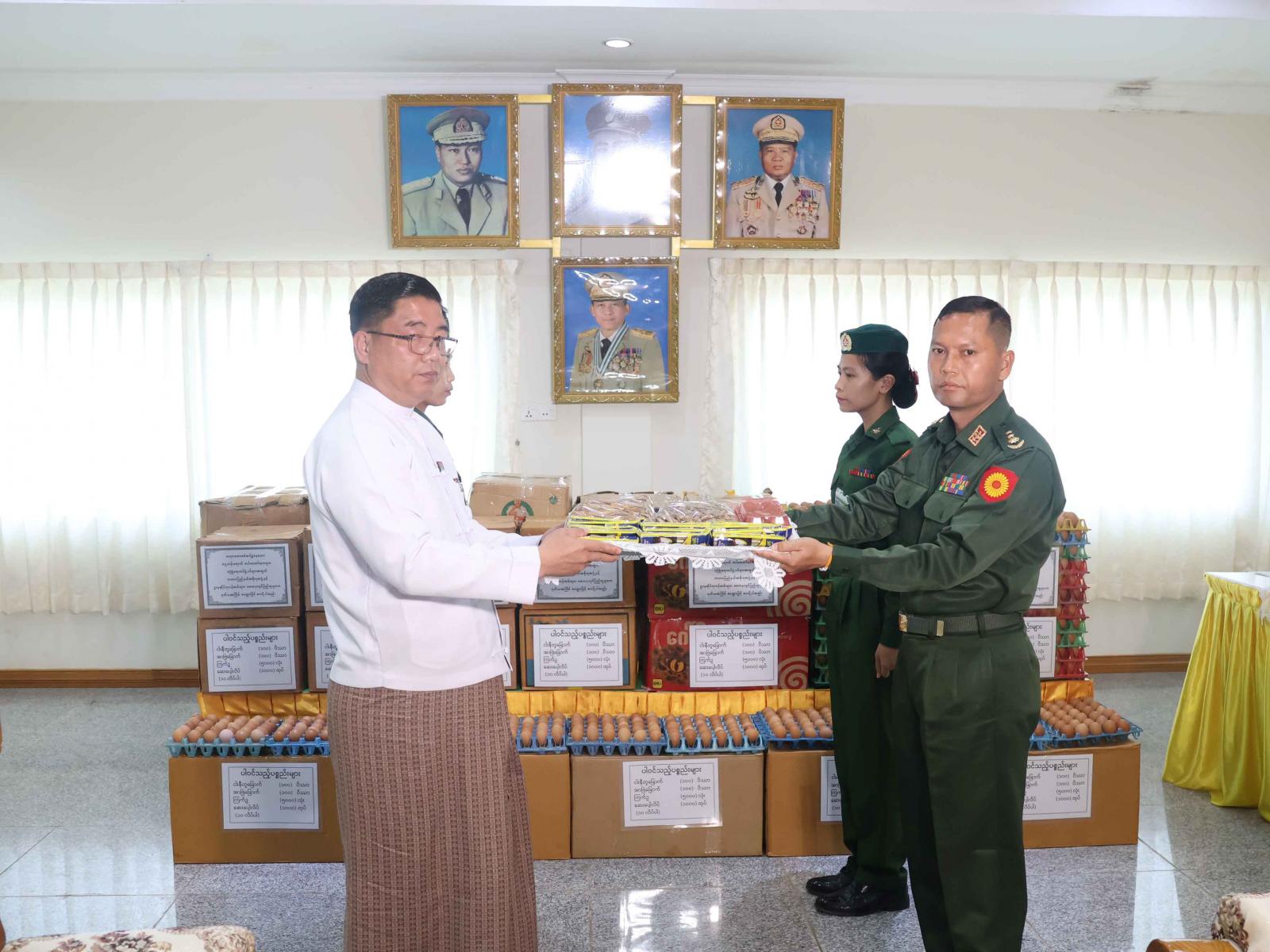 ယင်းသို့ပေးအပ်လှူဒါန်းရာတွင် ပြည်နယ်ဝန်ကြီးချုပ် ဦးဇော်မျိုးတင်က စားသောက်ဖွယ်ရာများပေးအပ်ရာ ဒေသကွပ်ကဲရေးမှူးမှ လက်ခံရယူ၍ ဂုဏ်ပြုမှတ်တမ်းလွှာ ပြန်လည်ပေးအပ်ခဲ့သည်။ ဆက်လက်၍ ပြည်နယ်သံယံဇာတရေးရာဝန်ကြီး ဦးစောဟူးဟူးက စားသောက်ဖွယ်ရာများပေးအပ်ရာ ရှေ့တန်းအမှတ်(၆၆)ခြေမြန်တပ်မဌာနချုပ် အမှတ် (၆၆) နည်းဗျူဟာမှူးက လက်ခံရယူခဲ့ပြီး ဒေသကွပ်ကဲရေးမှူးက ကျေးဇူးတင်စကား ပြန်လည်ပြောကြားခဲ့သည်။