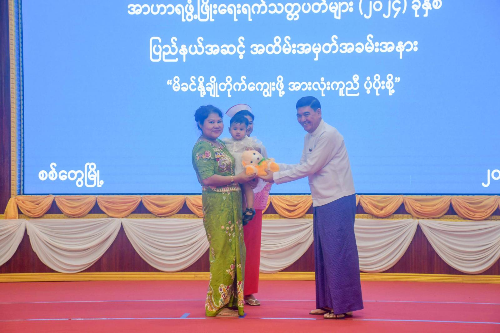 ယင်းနောက် ပြည်သူ့ကျန်းမာရေးဦးစီးဌာန၊ ပြည်နယ်ဦးစီးမှူး ဒေါက်တာကြည်လွင်က အာဟာရဖွံ့ဖြိုးရေးရက်သတ္တပတ်များ ကျင်းပရခြင်းအကြောင်းကို ရှင်းလင်းတင်ပြသည်။ ထို့နောက် ပြည်နယ်ဝန်ကြီးချုပ်နှင့် ပြည်နယ်ဝန်ကြီးများက စံပြနို့တိုက်မိခင်ဆု၊ အာဟာရသားကောင်းမိခင်စံပြဆု၊ ကျန်းမာပြည့်ဝအာဟာရကလေးစံပြဆု၊ ဘဝရှေ့ဆောင်ရက်(၁၀၀၀)စံပြဆုနှင့် ကျန်းမာဉာဏ်ရွှင်သားကောင်းမိခင်ဆုရရှိကြသော မိခင်များနှင့်ကလေးများအား ဆုများပေးအပ်ချီးမြှင့်ကြကာ ကမ္ဘာ့မိခင်နို့တိုက်ကျွေးရေး ရက်သတ္တပတ်အသိပညာပေး Video Clip ပြသသည်။