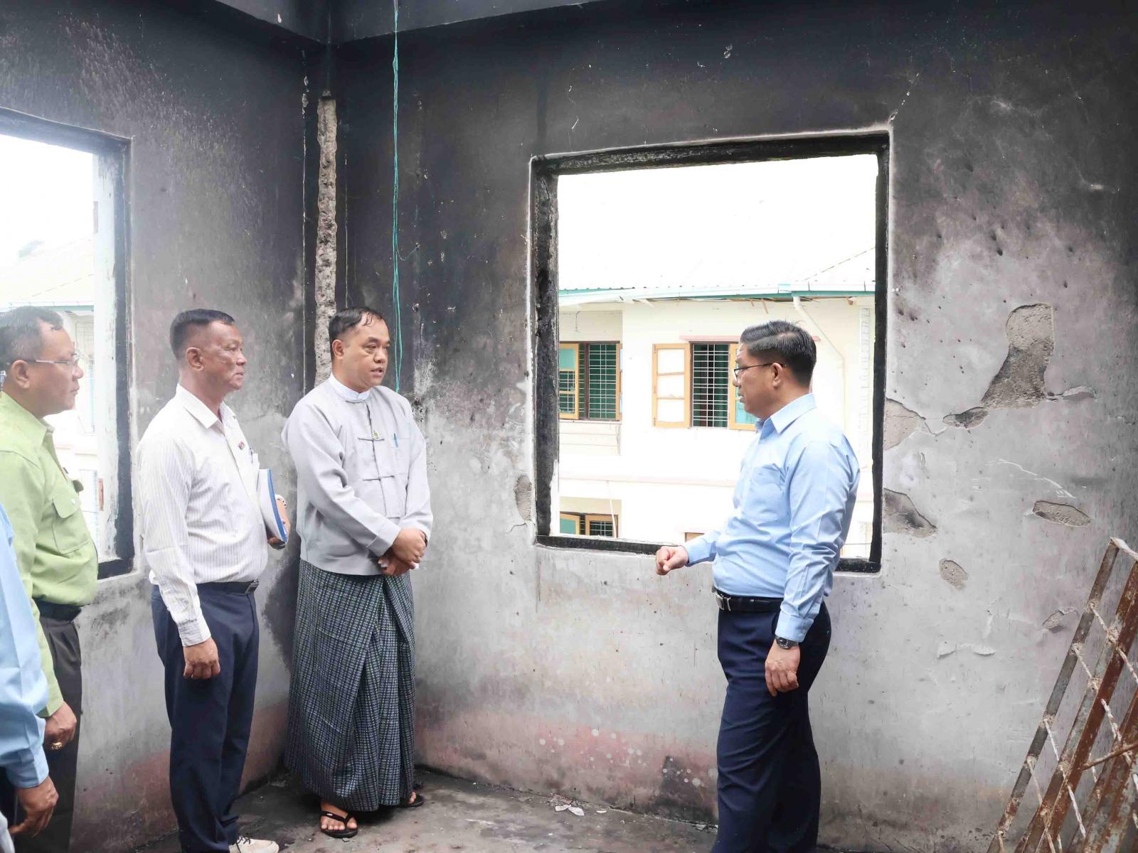 ဆက်လက်၍ အကြမ်းဖက်သောင်းကျန်းသူများ၏ အဖျက်အမှောင့်ဆောင်ရွက်ခဲ့မှုကြောင့်ပျက်စီးသွားသည့် နှစ်ထပ်ဈေးနှင့်ဗဟိုဈေးသို့ သွားရောက်ကြည့်ရှုစစ်ဆေးခဲ့ပြီး ပြည်သူများအဆင်ပြေချောမွေ့စွာ ရောင်းဝယ်ဖောက်ကားနိုင်ရေးအတွက် ဈေးဆိုင်ခန်းများအား အမြန်ပြန်လည်ပြုပြင်နိုင်ရေး၊ နှစ်ထပ်ဈေး အောက်ထပ်ရှိ ဆိုင်ခန်းများ ပြန်လည်ဖွင့်လှစ် ရောင်းချနိုင်ရေး နှင့် GEC ဆိုင်ခန်းများ ပြန်လည်ပြင်ဆင်နိုင်ရေး ဆောင်ရွက်ရန်တို့ကို တာဝန်ရှိသူများအား မှာကြားခဲ့သည်။