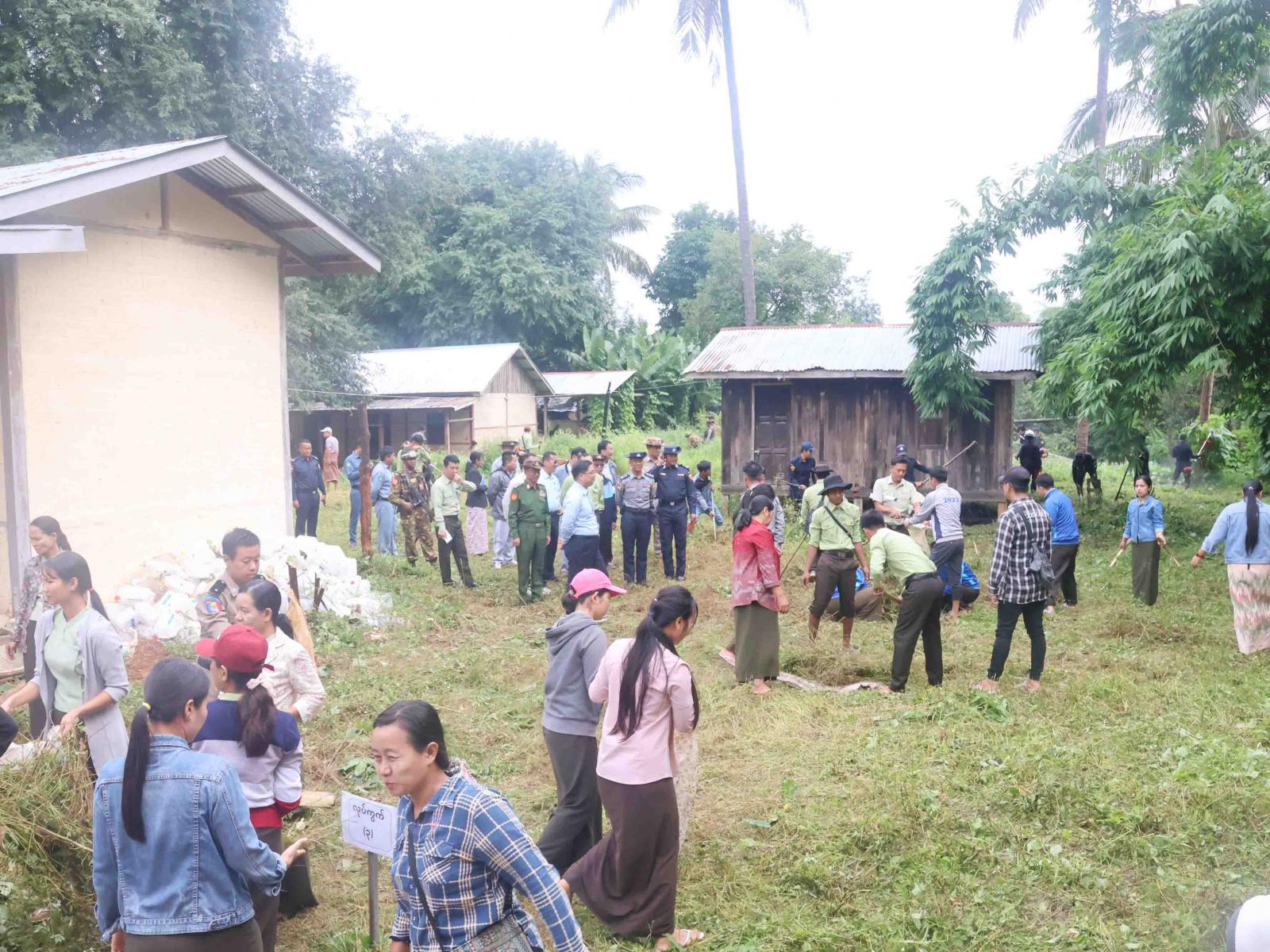 ဆက်လက်၍ ပြည်နယ်ဝန်ကြီးချုပ်နှင့် တာဝန်ရှိသူများသည် တောင်တန်းသာသနာပြု ဗဟိုတပ်ဦးကျောင်းပရိဝုဏ်အတွင်း မြန်မာနိုင်ငံရဲတပ်ဖွဲ့ဝင်များ၊ မီးသတ်တပ်ဖွဲ့ဝင်များ၊ ဌာနဆိုင်ရာများနှင့် ပြည်သူများက စုပေါင်းသန့်ရှင်းရေးဆောင်ရွက်နေမှုများ သွားရောက်ကြည့်ရှု အားပေးခဲ့ပြီး ပြည်သူများအား ရင်းရင်းနှီးနှီးနှုတ်ဆက်စကား ပြောကြားခဲ့သည်။