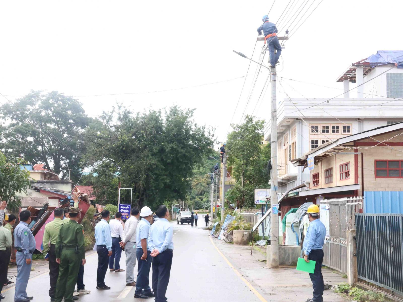 ရှေးဦးစွာ ပြည်နယ်ဝန်ကြီးချုပ်နှင့်တာဝန်ရှိသူများသည် လွိုင်ကော်မြို့ပေါ် ရပ်ကွက်များအတွင်း ပြည်သူများပြန်လည်ဝင်ရောက်နေထိုင်ရာတွင် လျှပ်စစ်မီးအမြန်ပြန်လည်ရရှိရေး ဆောင်ရွက်လျက်ရှိသည့် လုပ်ငန်းခွင်သို့သွားရောက်ခဲ့ရာ ဈေးပိုင်း ၊ ဓမ္မာရုံ ၊ မင်္ဂလာရပ်ကွက် အတွင်း၌ 11 KV ဓာတ်အားလိုင်း(၁၁၀၀)ပေ ပြန်လည်ပြုပြင်တည်ဆောက်ခြင်းလုပ်ငန်းများ ဆောင်ရွက်နေမှုကို သက်ဆိုင်ရာတာဝန်ရှိသူများက ရှင်းလင်းတင်ပြခဲ့ပြီး (၄၈)နာရီအတွင်း လျှပ်စစ်မီးရရှိရေးအတွက် လျှပ်စစ်ဝန်ထမ်းများက ဓာတ်အားလိုင်းများ ပြင်ဆင်ဆောင်ရွက် ပေးနေမှုနှင့် ထရန်စဖော်မာ တပ်ဆင်ပေးနေမှုများကို ကြည့်ရှုစစ်ဆေးခဲ့ကာ လိုအပ်သည်များကို ညှိနှိုင်းဆောင်ရွက်ပေးခဲ့သည်။