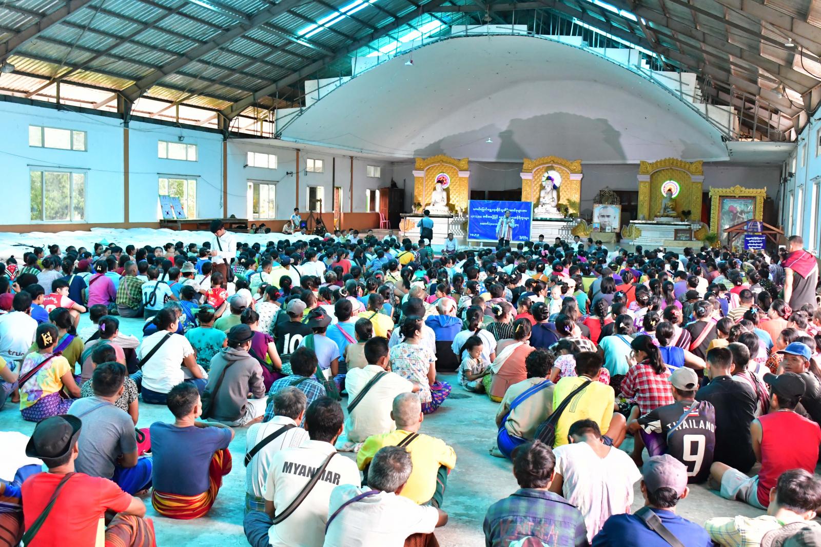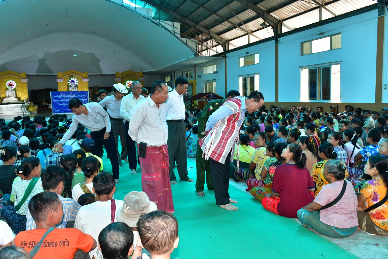 ထို့နောက် ပြည်နယ်ဝန်ကြီးချုပ်နှင့်အဖွဲ့သည် မြိုင်ကြီးငူအထူးဒေသ အေးလင်းသာယာ ကျောက်စာကွင်း၌ ယာယီပြောင်းရွှေ့နေထိုင်သူအိမ်ထောင်စုများအား APTERR အစီအစဉ်ဖြင့် လှူဒါန်းသောဆန်ရိက္ခာများ ထောက်ပံ့ပေးအပ်ရာ ပြည်နယ်ဝန်ကြီးချုပ်က ယာယီနေထိုင်စဉ်ကာလ အတွင်း စည်းစည်းလုံးလုံးနေထိုင်ကြစေလိုပြီး ကျန်းမာရေးကို အထူးဂရုစိုက်ကြရန်၊ တစ်ကိုယ်ရည် သန့်ရှင်းရေး၊ ပတ်ဝန်းကျင်သန့်ရှင်းရေးဂရုပြုကြရန်၊ ကျောင်းနေအရွယ်ကလေးငယ်များ ကျောင်းအပ်နှံ၍ ပညာရေးနှောင့်နှေးမှုမရှိစေရေး ကြိုးစားဆောင်ရွက်ကြရန်၊ စည်းကမ်းနှင့်အညီ နေထိုင်ပြီး တာဝန်ရှိသူများ၏ပြောဆိုဆုံးမမှုများကိုနာခံ၍ ဆရာတော်ကြီးများနှင့်ဂေါပကအဖွဲ့များ၏ ဆုံးမဩဝါဒနှင့်အညီ နေထိုင်ကြရန် အားပေးစကားများပြောကြားပြီး ပြည်နယ်ဝန်ကြီးချုပ်၊ ပြည်နယ်အစိုးရအဖွဲ့ဝင်များနှင့် တာဝန်ရှိသူများက မြိုင်ကြီးငူအထူးဒေသရှိ ယာယီပြောင်းရွှေ့နေထိုင်သူ အိမ်ထောင်စု ၁၀၅၆ စု လူဦးရေ ၅၅၂၆ ဦးအတွက် APTERR အစီအစဉ်ဖြင့်လှူဒါန်းသော ၄၀ ကီလိုဂရမ် ဆန်အိတ် ၉၆၇ အိတ်ကို ထောက်ပံ့ပေးအပ်ခဲ့ကြကာ ယာယီပြောင်းရွှေ့နေထိုင်သူများအား ရင်းနှီးနွေးထွေးစွာ တွေ့ဆုံနှုတ်ဆက်၍ အားပေးစကားများပြောကြားခဲ့ကြသည်။