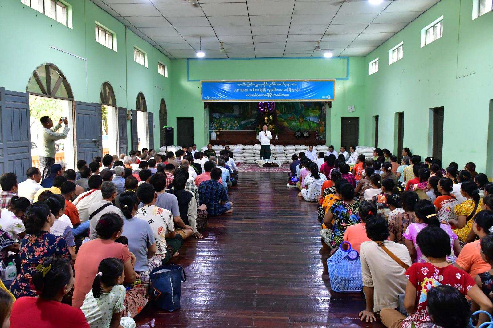 ထို့နောက် ပြည်နယ်ဝန်ကြီးချုပ်နှင့်အဖွဲ့သည် သမိုင်းဝင်ကြောင့်ကမ်လာဘ်စေတီတော်ဓမ္မာရုံ၌ ယာယီပြောင်းရွှေ့နေထိုင်သူများနှင့်တွေ့ဆုံအားပေးစကားပြောကြားပြီး အိမ်ထောင်စု ၂၁၃ စု၊ လူဦးရေ ၈၁၂ ဦးအတွက် APTERR အစီအစဉ်ဖြင့်လှူဒါန်းသော ဆန် ၁၄၂ ကီလိုဂရမ်းအား ထောက်ပံ့ပေးအပ်ကာ ယာယီပြောင်းရွှေ့နေထိုင်သူများအား ရင်းနှီးနွေးထွေးစွာတွေ့ဆုံနှုတ်ဆက်၍ အားပေးစကားများပြောကြားခဲ့သည်။
