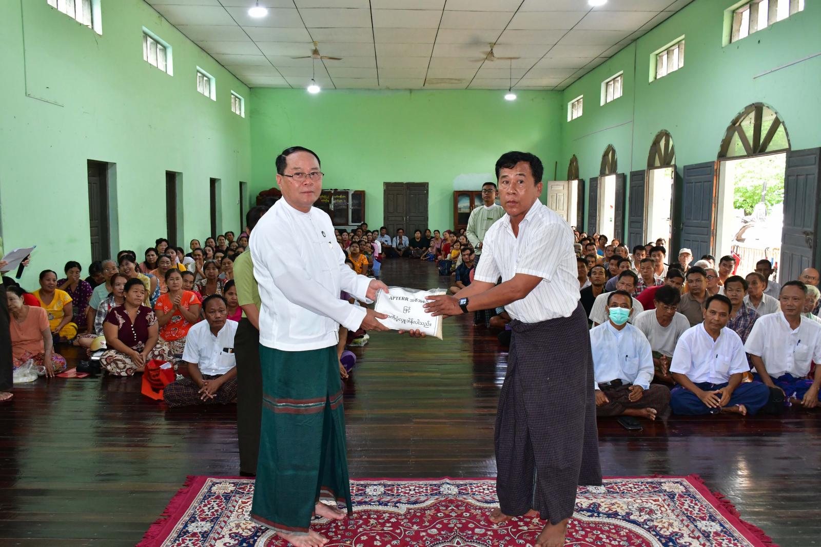 ထို့နောက် ပြည်နယ်ဝန်ကြီးချုပ်နှင့်တာဝန်ရှိသူများက ယာယီပြောင်းရွှေ့နေထိုင်သူ အိမ်ထောင်စု (၃၆၈)စု၊ လူဦးရေ ၁၅၁၉ ဦးအတွက် APTERR အစီအစဉ်ဖြင့်လှူဒါန်းသော ဆန် ၂၆၅ ဒဿမ ၈၃ ကီလိုဂရမ်ကို ထောက်ပံ့ပေးအပ်ခဲ့ကြပြီး ယာယီပြောင်းရွှေ့နေထိုင်သူများအား ရင်းနှီးနွေးထွေးစွာ တွေ့ဆုံနှုတ်ဆက်၍ အားပေးစကားများပြောကြားခဲ့သည်။