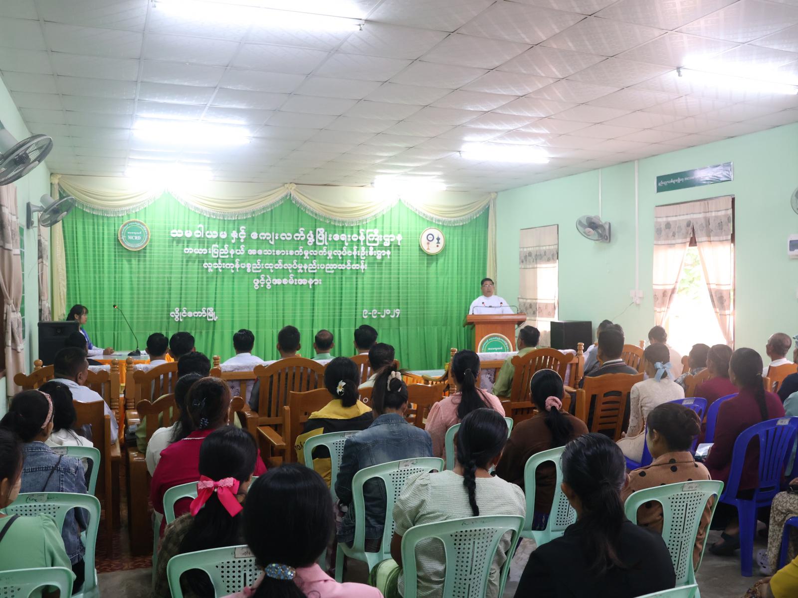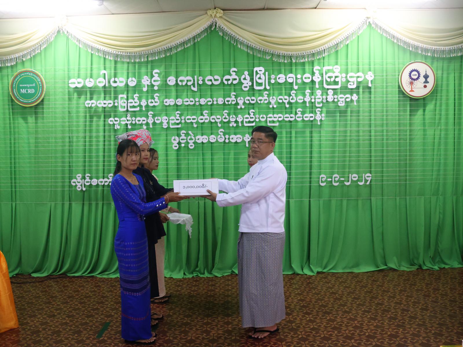 ထို့နောက် ပြည်နယ်အသေးစားစက်မှုလက်မှုလုပ်ငန်းဦးစီးဌာန၊ ပြည်နယ်ဦးစီးမှူးက သင်တန်းဖွင့်လှစ်ရခြင်း အကြောင်းအရာနှင့်စပ်လျဉ်း၍ ရှင်းလင်းတင်ပြခဲ့ပြီး ပြည်နယ်ဝန်ကြီးချုပ်က သင်တန်းသားများအတွက် ထောက်ပံ့ငွေကျပ်(၁၀)သိန်း ပေးအပ်ခဲ့သည်။