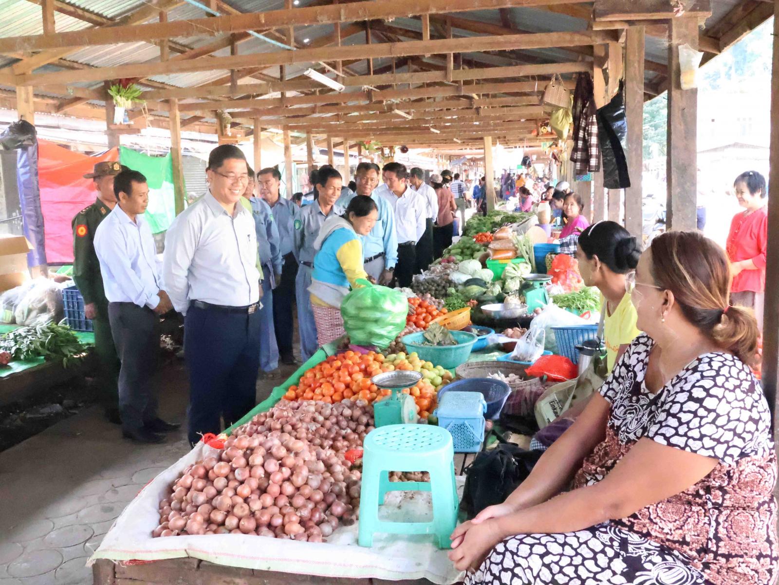 ဆက်လက်၍ သီရိမင်္ဂလာ(ယာယီ)ဈေးအတွင်း ဈေးရောင်းချနေမှုများအား လှည့်လည်ကြည့်ရှုအားပေးကာ တာဝန်ရှိသူများအား “ကုန်ဈေးနှုန်းတည်ငြိမ်ရေး၊ ကုန်စည်စီးဆင်းမှု မှန်ကန်စေရေး၊ အဓိကစားသောက်ကုန်ဖြစ်သည့် ဆန်၊ ဆီ ဈေးနှုန်းများ တည်ငြိမ်ရေးနှင့် ပြတ်လပ်မှုမရှိစေရေး၊ ဈေးအား အမြဲသန့်ရှင်းသပ်ရပ်ရေး အလေးထားဆောင်ရွက်ရန်” တို့ကို မှာကြားပြီး ဈေးရောင်းချသူများအား ရင်းရင်းနှီးနှီးနှုတ်ဆက်စကားပြောကြားခဲ့သည်။