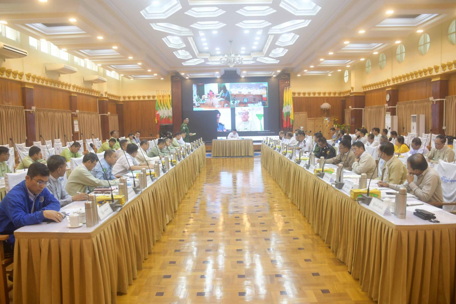 ဆက်လက်၍ တက်ရောက်လာကြသော ပြည်နယ်အဆင့်ဌာနဆိုင်ရာများက သဘာဝဘေးအန္တရာယ်နှင့်ပတ်သက်၍ ကြိုတင်ပြင်ဆင်ဆောင်ရွက်မည့်အခြေအနေများကို အကြံပြုဆွေးနွေးတင်ပြကြပြီး ခရိုင်စီမံအုပ်ချုပ်ရေးအဖွဲ့ဥက္ကဋ္ဌများက မိမိတို့ခရိုင်အလိုက် ကြိုတင်ကာကွယ်ရေးလုပ်ငန်းများ ဆောင်ရွက်ထားရှိမှု အခြေအနေများ၊ ကယ်ဆယ်ရေးပစ္စည်းများစုဖွဲ့ထားရှိမှုတို့ကို ရှင်းလင်းတင်ပြကြသည်။
