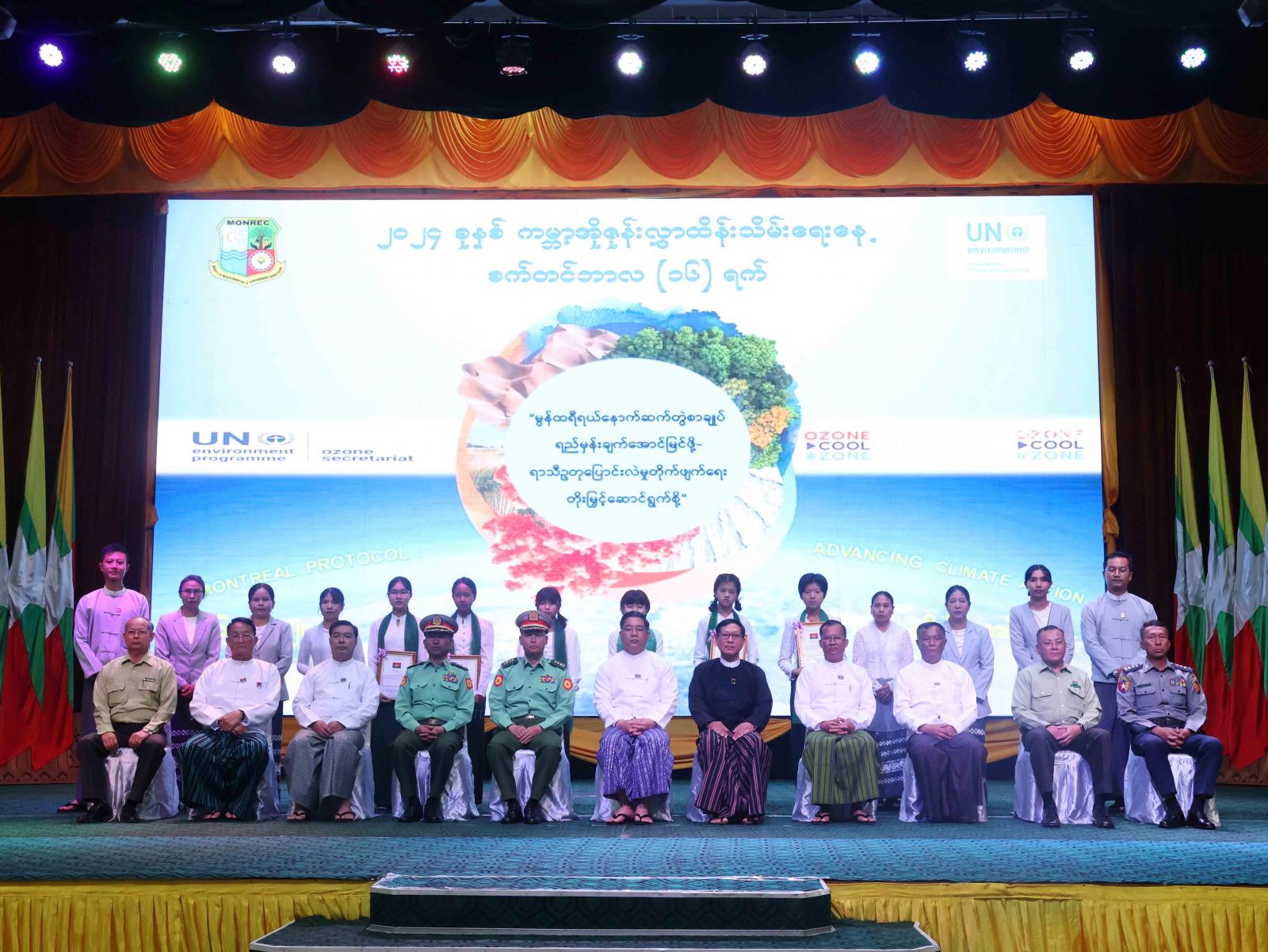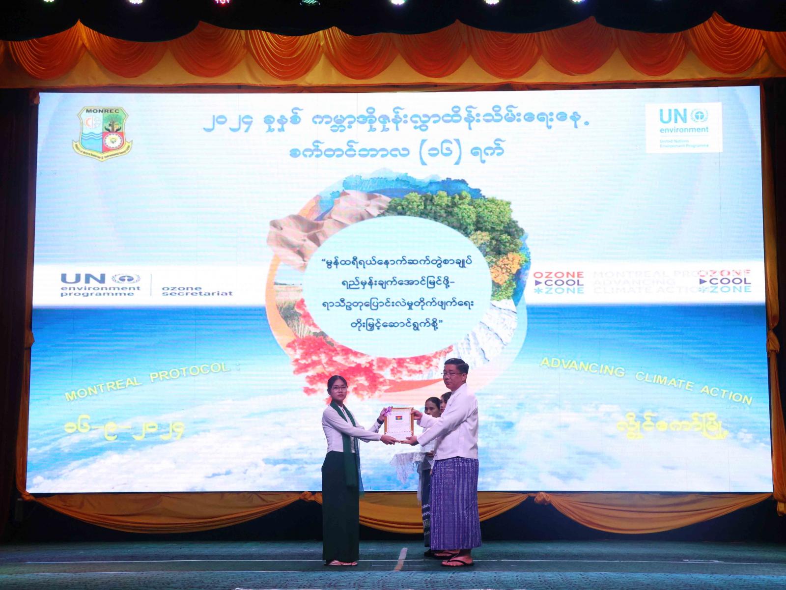ထို့နောက် ကမ္ဘာ့အိုဇုန်းလွှာထိန်းသိမ်းရေးနေ့ အထိမ်းအမှတ် Video Clip အားပြသခဲ့သည်။ ဆက်လက်၍ ၂၀၂၄ ခုနှစ်၊ ကမ္ဘာ့အိုဇုန်းလွှာထိန်းသိမ်းရေးနေ့ အထိမ်းအမှတ် အခြေခံပညာ အထက်တန်းအဆင့်နှင့် အလယ်တန်းအဆင့် စာစီစာကုံးပြိုင်ပွဲတွင် ပထမဆုရရှိကြသူများကို ပြည်နယ်ဝန်ကြီးချုပ် ဦးဇော်မျိုးတင်၊ ဒုတိယဆုရရှိသူများကို ဒေသကွပ်ကဲရေးမှူး ဗိုလ်မှူးကြီး အောင်ကျော်ခိုင်နှင့် တတိယဆုရရှိသူများကို သယံဇာတရေးရာဝန်ကြီး ဦးစောဟူးဟူးတို့က ဆုများအသီးသီး ချီးမြှင့်ပေးအပ်ခဲ့ကြပြီး စုပေါင်းမှတ်တမ်းတင် ဓါတ်ပုံရိုက်ကူးခဲ့ကြသည်။