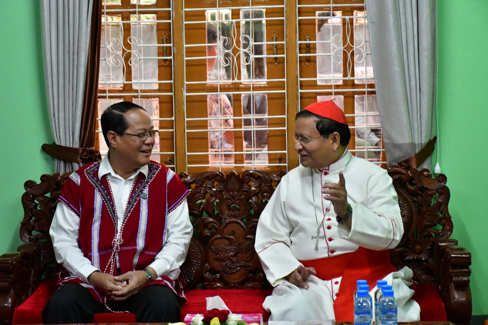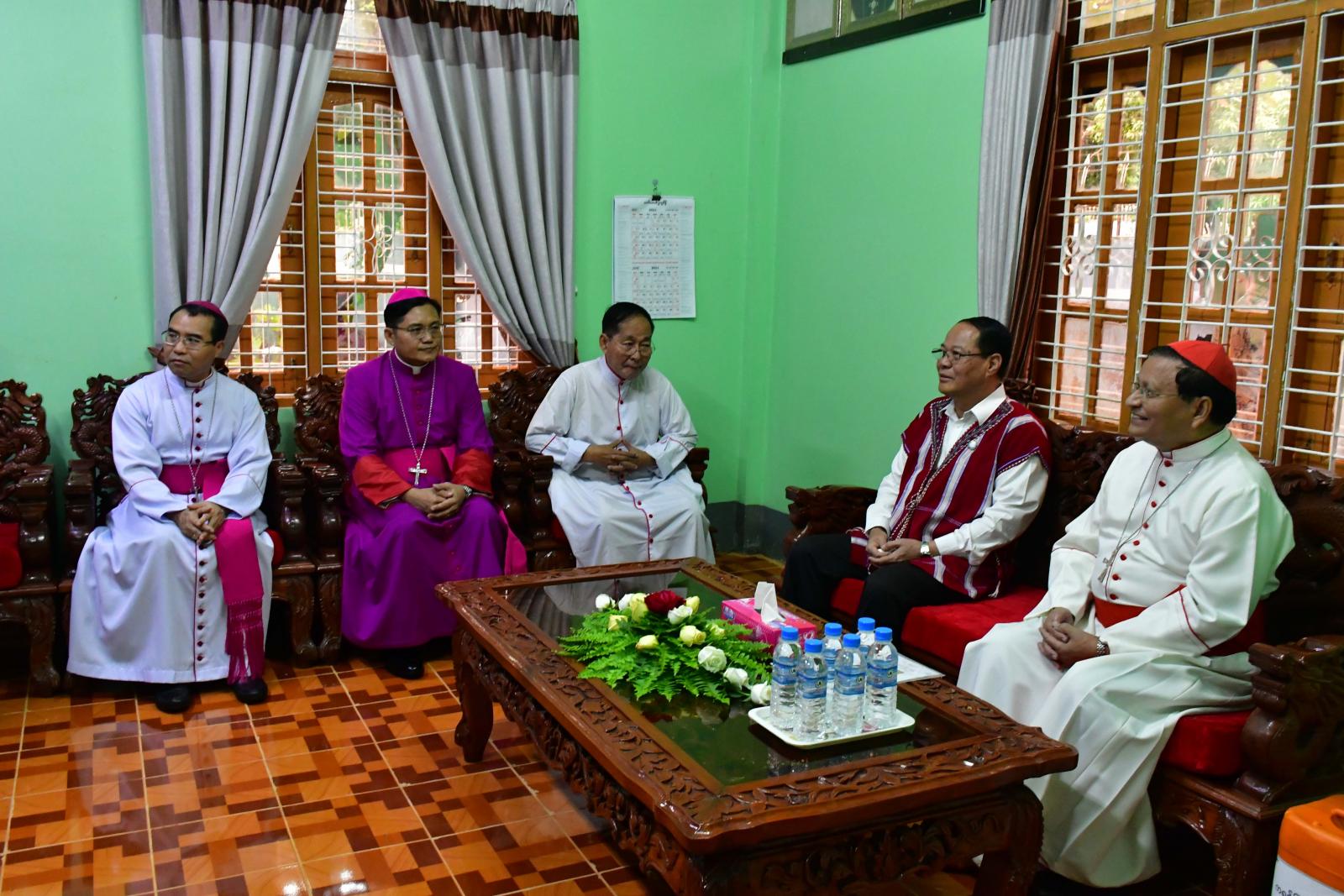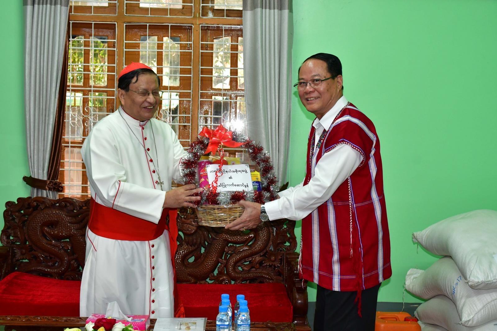 မြန်မာနိုင်ငံလုံးဆိုင်ရာကက်သလစ်ဆရာတော်ကြီးများအဖွဲ့ချုပ်ဥက္ကဋ္ဌ H.E. Cardinal Charles Bo(ကာဒီနယ်ချားလ်စ်ဘို)သည် ဘားအံကက်သလစ်ဂိုဏ်းအုပ်သာသနာပိုင်ဆရာတော်ကြီး၏ အရိုက်အရာကိုဆက်ခံမည့် ဆရာတော် Msgr.Stanislaus Min Ko(စတန်းနစ်စလော့မင်းကို)၏ သိက္ခာခံယူခြင်းအထိမ်းအမှတ်အခမ်းအနားသို့ လာရောက်ခြင်းဖြစ်ပြီး ဂါရဝပြုတွေ့ဆုံရာ၌ ပြည်နယ်ဝန်ကြီးချုပ်က နှုတ်ခွန်းဆက်စကားပြောကြားရာတွင် မိမိတို့ပြည်နယ်အစိုးရအဖွဲ့အနေဖြင့် ဘာသာကြီး(၄)ခုနှင့်ပတ်သက်၍ လိုအပ်သည်များကူညီဆောင်ရွက်ပေးလျက်ရှိသကဲ့သို့ ဆရာတော်ကြီးများ၏ အကြံဉာဏ်ကိုရယူ၍ ရှေ့လုပ်ငန်းစဉ်များကိုဆောင်ရွက်လျက်ရှိကြောင်း၊ ပြည်နယ်အတွင်းရှိ ဒေသအချို့တွင် တည်ငြိမ်အေးချမ်းမှုအားနည်းသည့်အတွက်ကြောင့် ယာယီနေရပ်စွန့်ခွာကြရသူများအား ကူညီစောင့်ရှောက်မှုများ ဆောင်ရွက်ပေးလျက်ရှိပြီး ငြိမ်းချမ်းရေးရှိမှသာ ဒေသခံပြည်သူများ၏ လူမှုစီးပွားဘဝများတိုးတက်အောင် ဆောင်ရွက်နိုင်မည်ဖြစ်သည့်အတွက် ငြိမ်းချမ်းရေးနှင့်ပတ်သက်၍ ဆုတောင်းမေတ္တာများပို့သပေးကြစေလိုကြောင်း၊ ငြိမ်းချမ်းရေးရရှိပြီး သဘာဝဘေးကင်းဝေးစေရန်၊ ငြိမ်းချမ်းသာယာသည့်လူ့ဘောင်သစ်ကြီးပေါ်ပေါက်လာစေရန် အဘက်ဘက်မှ ဝိုင်းဝန်းပူးပေါင်းကူညီဆောင်ရွက်ပေးစေလိုပြီး အားနည်းချက်၊ အားသာချက်များကိုလည်း ဝေဖန်ထောက်ပြအကြံပြု ပေးကြစေလိုကြောင်း ပြောကြားသည်။