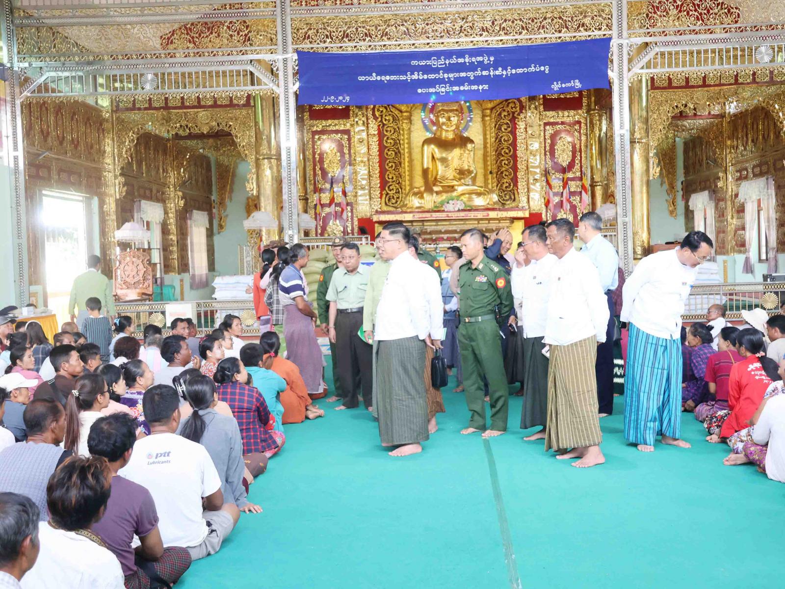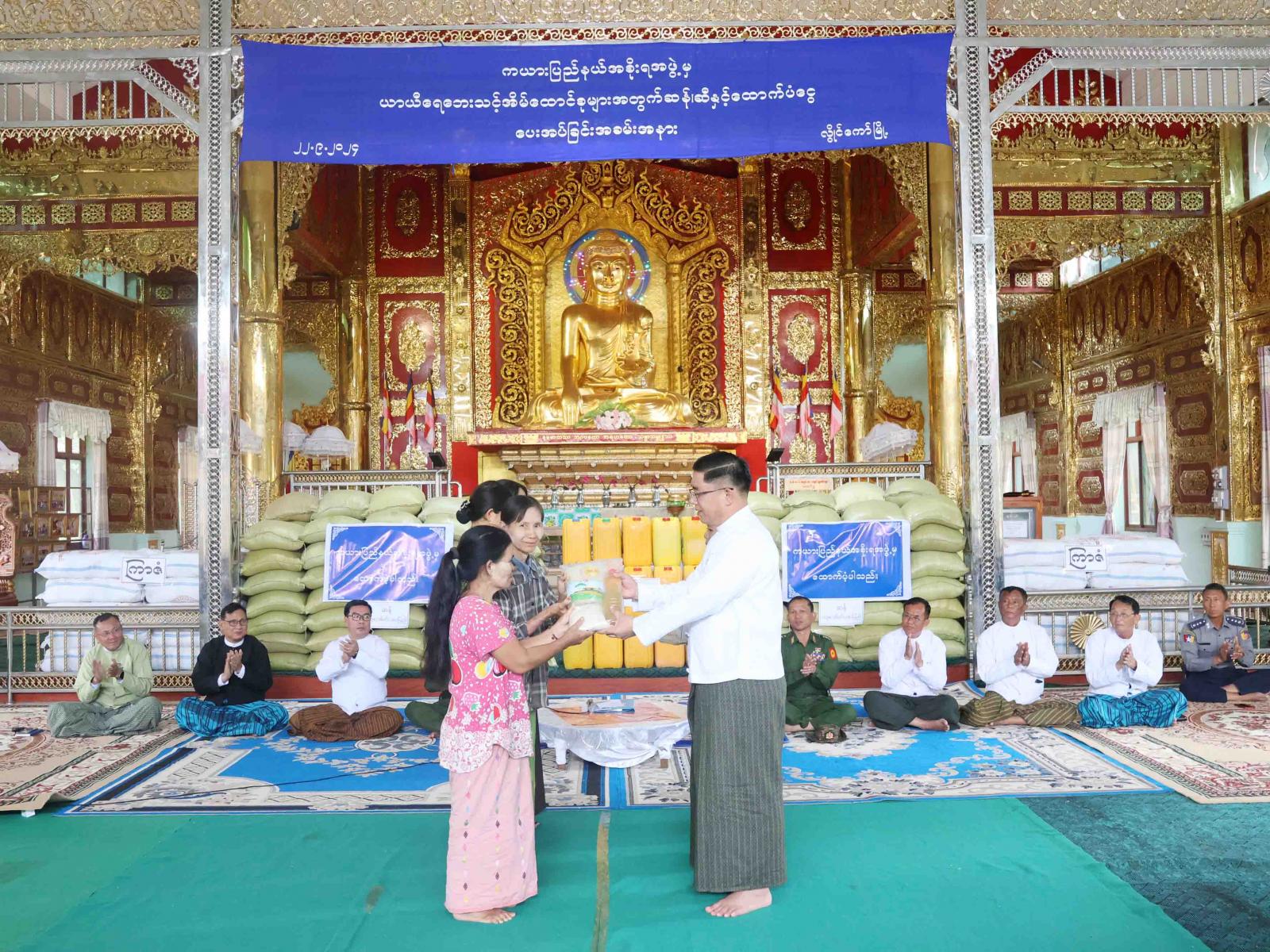 ယနေ့အခမ်းအနားတွင် ကယားပြည်နယ်အစိုးရအဖွဲ့မှ ရေဘေးသင့် အိမ်ထောင်စု (၅၀၇) စုရှိ လူဦးရေ (၁၇၃၂) ဦးအတွက် ဆန် (၆) ပြည်နှုန်းဖြင့် (၁၂၆.၇၅) အိတ်၊ ဆီ(၅၀) ကျပ်သား နှုန်းဖြင့် (၂၅၃.၅) ပိဿာ၊ ပြည်နယ်ဘေးအန္တရာယ်ဆိုင်ရာ စီမံခန့်ခွဲမှုဦးစီးဌာနမှ လူတစ်ဦးလျှင် ဆန်ဖိုးငွေ (၂၁၀၀) ကျပ်နှုန်းဖြင့် တစ်ပတ်စာ၊ စားအုန်းဆီ၊ မာမီးခေါက်ဆွဲ အသေးနှင့် ကြာဆံထုပ် စုစုပေါင်းတန်ဖိုး (၃၈၄၉၂၀၀) ကျပ်အား ထောက်ပံ့ပေးခဲ့ကြောင်း သိရသည်။