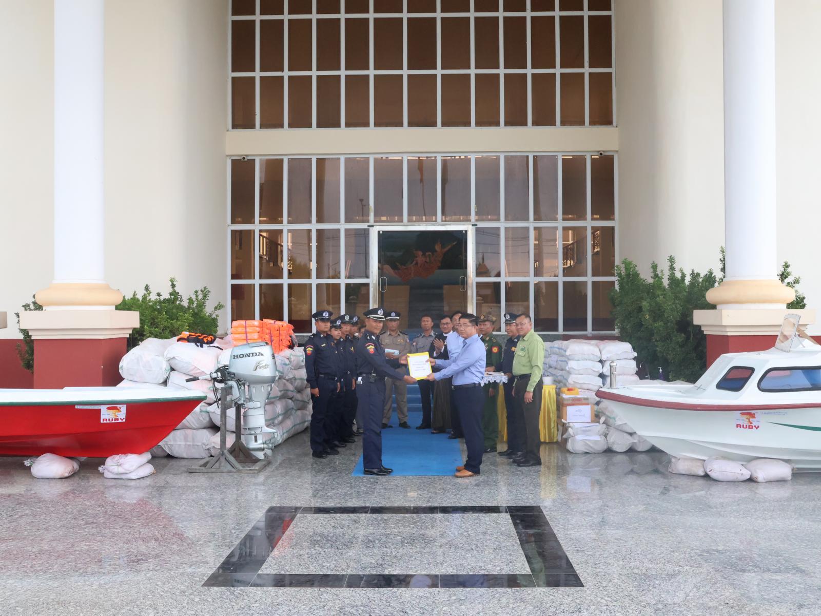 ထို့နောက် ရေဘေးကယ်ဆယ်ရေးလုပ်ငန်းများတွင်အသုံးပြုရန် ပြည်နယ်အစိုးရရန်ပုံငွေဖြင့်ထောက်ပံ့သည့် ဖိုက်ဘာလှေ(၂)စီး ၊ တွဲဖက်အသုံးပြုမည့် (SUZUKI) အမျိုးအစား (40 HP) အင်ဂျင်(၂)လုံး၊ (HONDA) အမျိုးအစား (30 HP) အင်ဂျင်(၁)လုံး၊ အသက်ကယ်အင်္ကျီအကြီး(၅၀၀)နှင့် အသေး(၁၀၀)ထည်တို့ကို ပြည်နယ်မီးသတ်ဦးစီးဌာနသို့လွှဲပြောင်းပေးအပ်ရာ ပြည်နယ်မီးသတ်ဦးစီးဌာနညွှန်ကြားရေးမှူးက လက်ခံရယူသည်။ ဆက်လက်ပြီး ဘေးအန္တရာယ်ဆိုင်ရာစီမံခန့်ခွဲမှုဦးစီးဌာနမှ နေအိမ်များ ရေဝင်ပျက်စီးပါကထောက်ပံ့ပေးရန် ထပ်မံဖြည့်တင်းပေးသည့် အိမ်ထောင်စု (၁၀၀)အတွက် ကယ်ဆယ်ရေးပစ္စည်း (၁၄)မျိုးပါ ပစ္စည်းများအား ကြည့်ရှုစစ်ဆေးခဲ့ပြီး စနစ်တကျဖြန့်ဖြူးနိုင်ရေး တာဝန်ရှိသူများအား မှာကြားခဲ့သည်။
