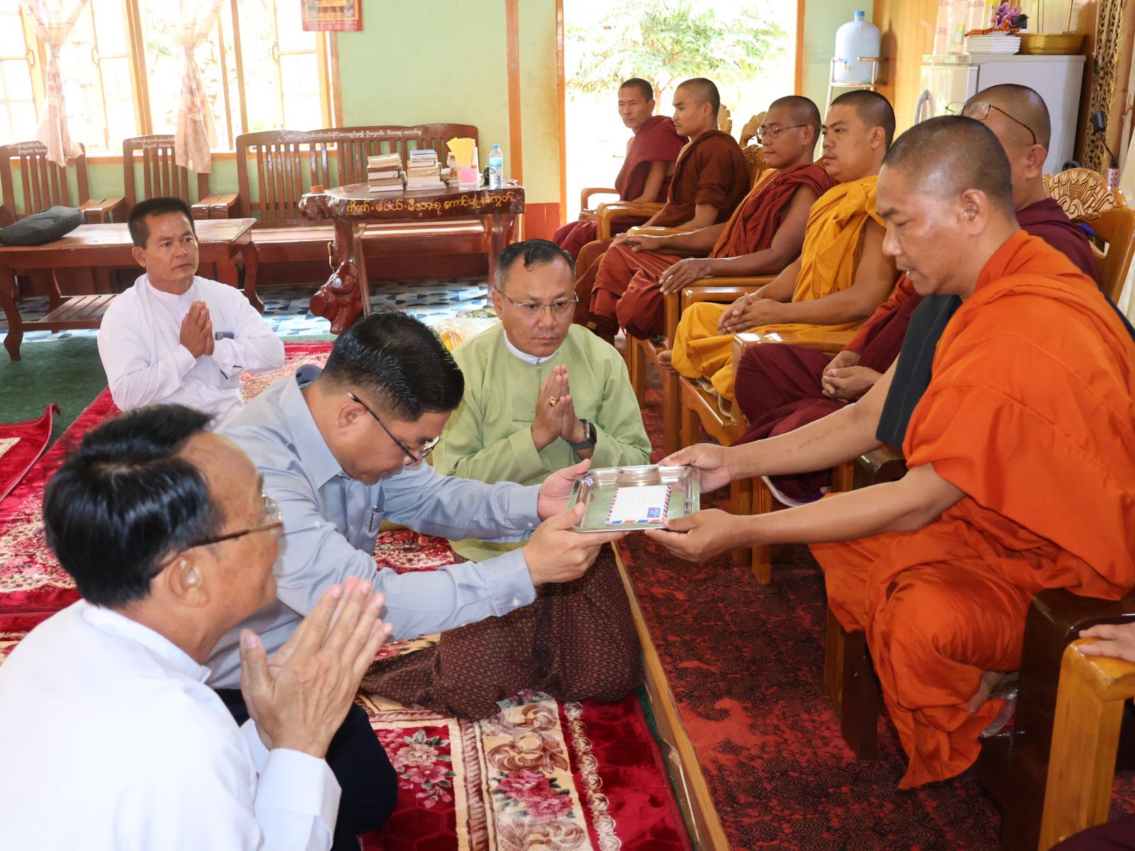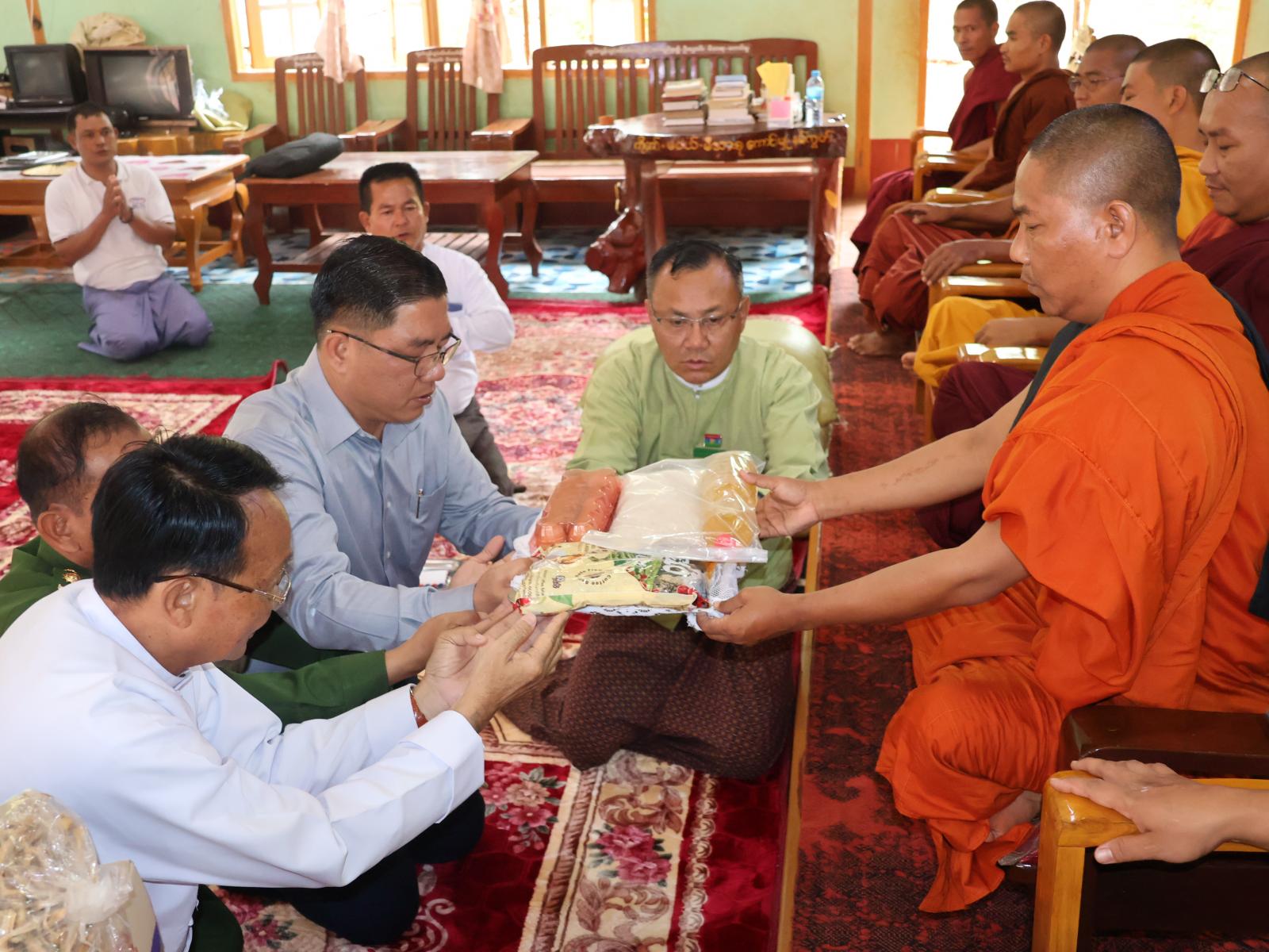 ဆက်လက်၍ မင်းကျောင်းကန်သာ တစ်လျှောက်၊ မင်းစုနှင့် နမ့်ကွတ်ရပ်ကွက်များအတွင်းရှိ နေအိမ်များ၌ ရေကြီးရေလျှံမှုအခြေအနေများကို လှည့်လည်ကြည့်ရှုခဲ့ပြီး နမ့်ကွတ်ရပ်ကွက်ရှိ မြို့နယ်တွဲဖက်အကျိုးတော်ဆောင် မစိုးရိမ်တိုက်သစ်ကျောင်း ဆရာတော် ဂန္ထဝါစကပဏ္ဍိတ ဘဒ္ဒန္တသုမနထံ သွားရောက်ဖူးမြော်ကြည်ညို၍ သာသနာရေးဆိုင်ရာများ လျှောက်ထားခြင်းနှင့် ဆွမ်းဆန်တော် ၊ ဆီနှင့် လှူဖွယ်ဝတ္ထုပစ္စည်းများ ဆက်ကပ်လှူဒါန်းခဲ့ပြီး ဝန်ကြီးချုပ်က “ကျောင်းအတွင်း သောက်သုံးရေရရှိရေး ဆောင်ရွက်ပေးရန်၊ ပြုပြင်ရန်လိုအပ်သည့် သာသနိကအဆောက်အဦများ စာရင်းပြုစုရန်နှင့် ရေများပြန်လည် ကျဆင်းပါက ကျောင်းဝန်းအတွင်း စုပေါင်းသန့်ရှင်းရေးဆောင်ရွက်ပေးရန်” တာဝန်ရှိသူများအား မှာကြားခဲ့ကြောင်းသိရသည်။