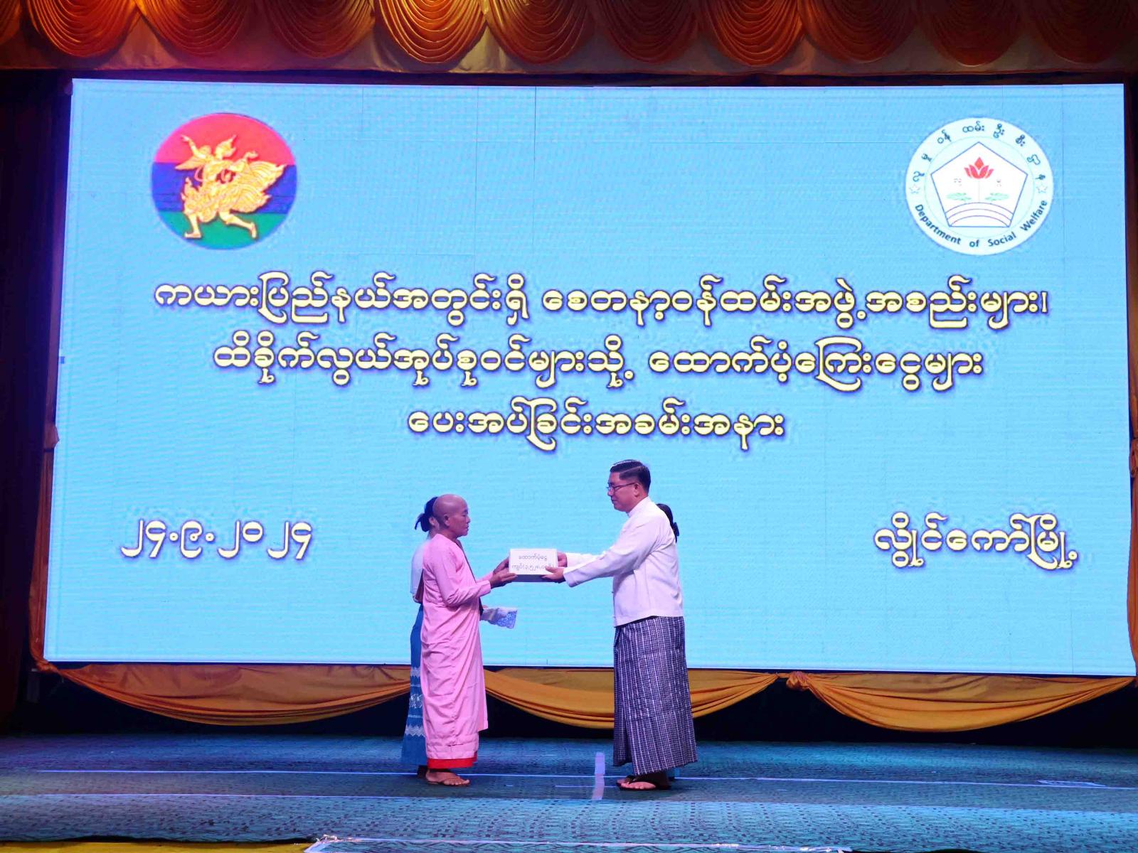 ထို့နောက် ပြည်နယ်ဝန်ကြီးချုပ်က မဟာပုညကာရီ စေတနာ့ဝန်ထမ်း အမျိုးသမီးဂေဟာ၊ ဒေသကွပ်ကဲရေးမှူးက စိန်မာတင်ဘိုးဘွားရိပ်သာ၊ ပြည်နယ်တရားသူကြီးချုပ်က ပြည်နယ်ဘိုးဘွားရိပ်သာ၊ လုံခြုံရေးနှင့်နယ်စပ်ရေးရာဝန်ကြီးက မဟာဓမ္မဝိဟာရီ စေတနာ့ဝန်ထမ်းအမျိုးသမီးဂေဟာ ၊ လူမှုရေးရာဝန်ကြီးက ထိခိုက်လွယ်အုပ်စုများဖြစ်သည့် အသက်(၇၅)နှစ်နှင့်အထက် သက်ကြီးဘိုးဘွားများနှင့် အသက်(၃)နှစ်အောက်ကလေးငယ်များအား ပေးအပ်ကြရာ သက်ဆိုင်ရာကိုယ်စားအသီးသီးတို့က လက်ခံရယူသည်။