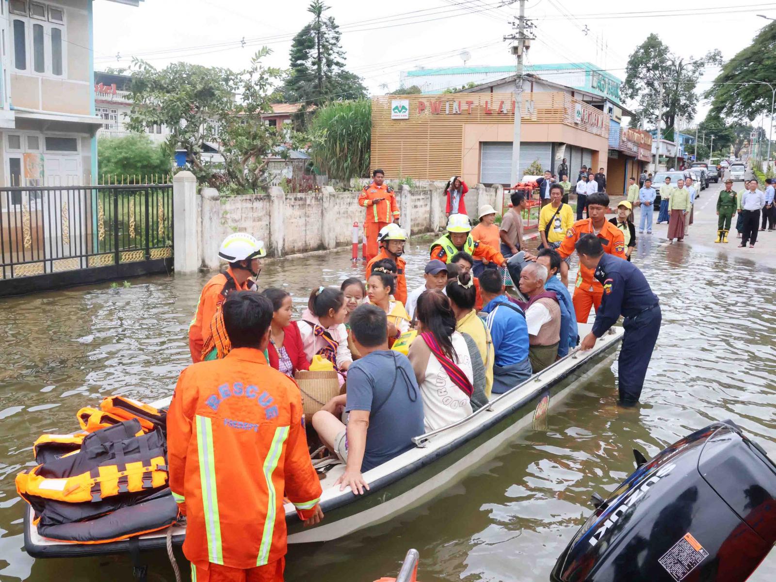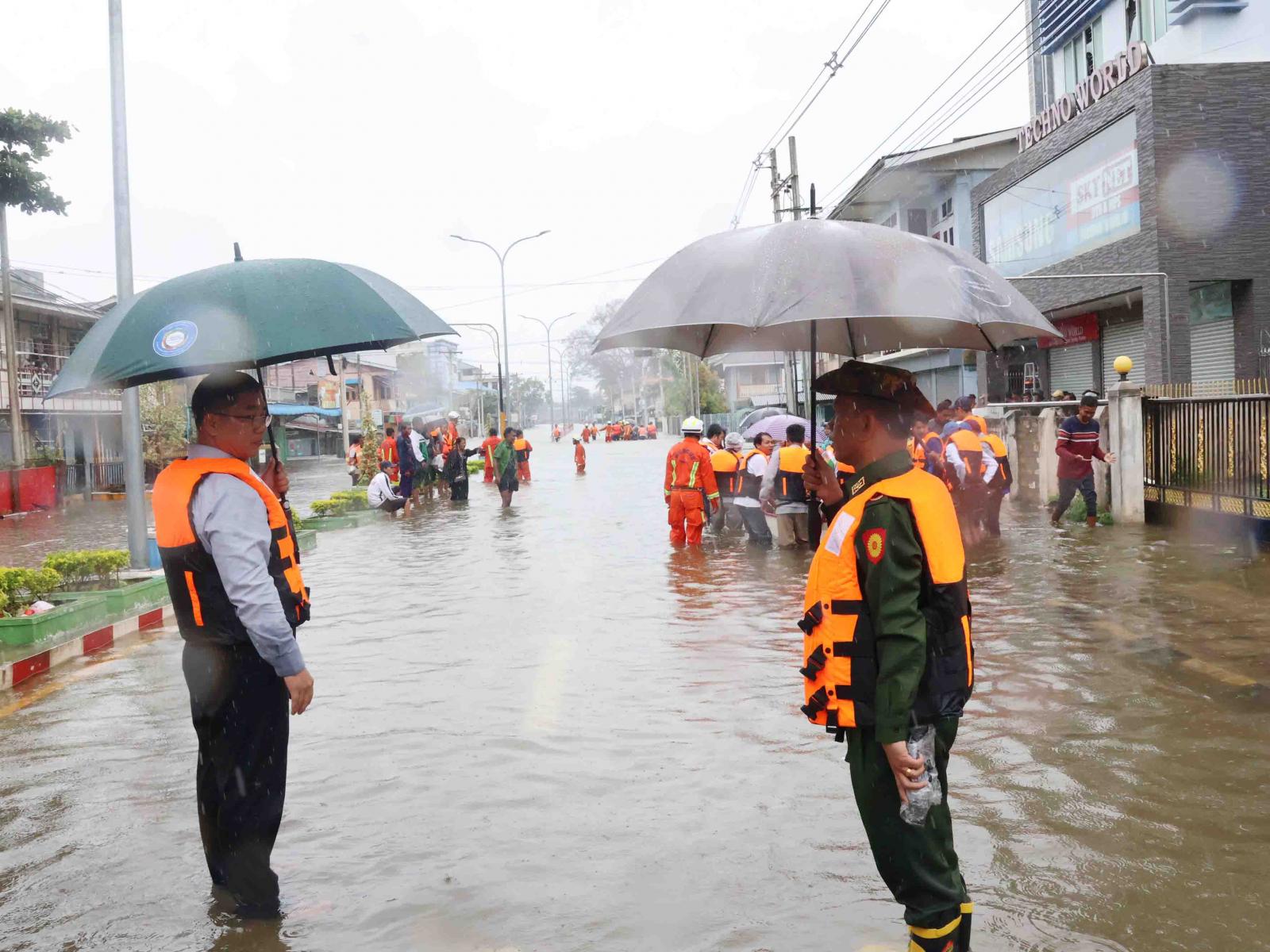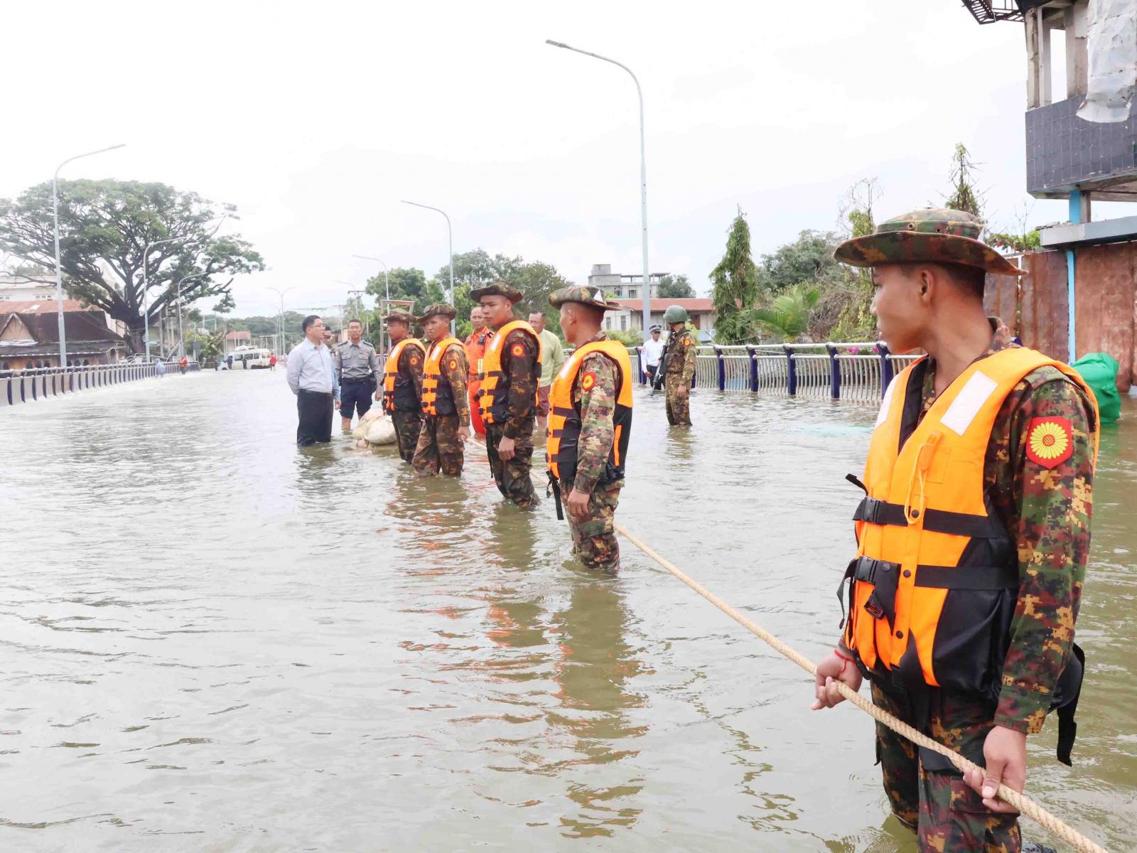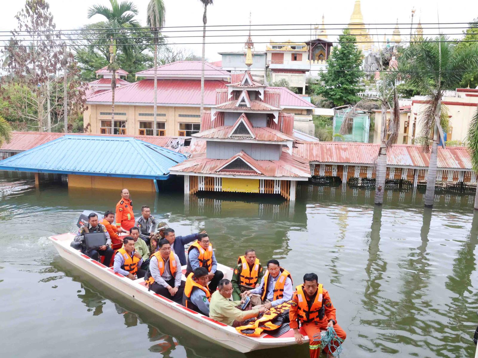 ဆက်လက်၍ ရေကြီးရေလျှံမှုများဖြစ်သည့် ရှမ်းပိုင်း၊ ဒေါနိုးကူး၊ ရှမ်းစု၊ ရွှေတောင်ရပ်ကွက်များအတွင်း စက်လှေဖြင့် လှည့်လည်ကြည့်ရှုခဲ့သည်။ ထို့နောက် ပြည်သူများ သွားလာရေးအဆင်ပြေစေရန် တပ်မတော်သားများ၊ မြန်မာနိုင်ငံရဲတပ်ဖွဲ့၊ မီးသတ်တပ်ဖွဲ့၊ ဝန်ထမ်းများ ကြက်ခြေနီနှင့် ပရဟိတအဖွဲ့များက စက်လှေများဖြင့် ကူညီပို့ဆောင်ပေးနေမှုများကို ကြည့်ရှုပြီး “ပြည်သူများအန္တရာယ်ကင်းရှင်းစွာ သွားလာနိုင်ရေးနှင့် ဘေးအန္တရာယ်မဖြစ်စေရေး၊ အလှည့်ကျစနစ်ဖြင့် တာဝန်ထမ်းဆောင်ကြရေး ကြီးကြပ်ကူညီဆောင်ရွက်ပေးကြရန်” တာဝန်ရှိသူများအား မှာကြားခဲ့သည်။