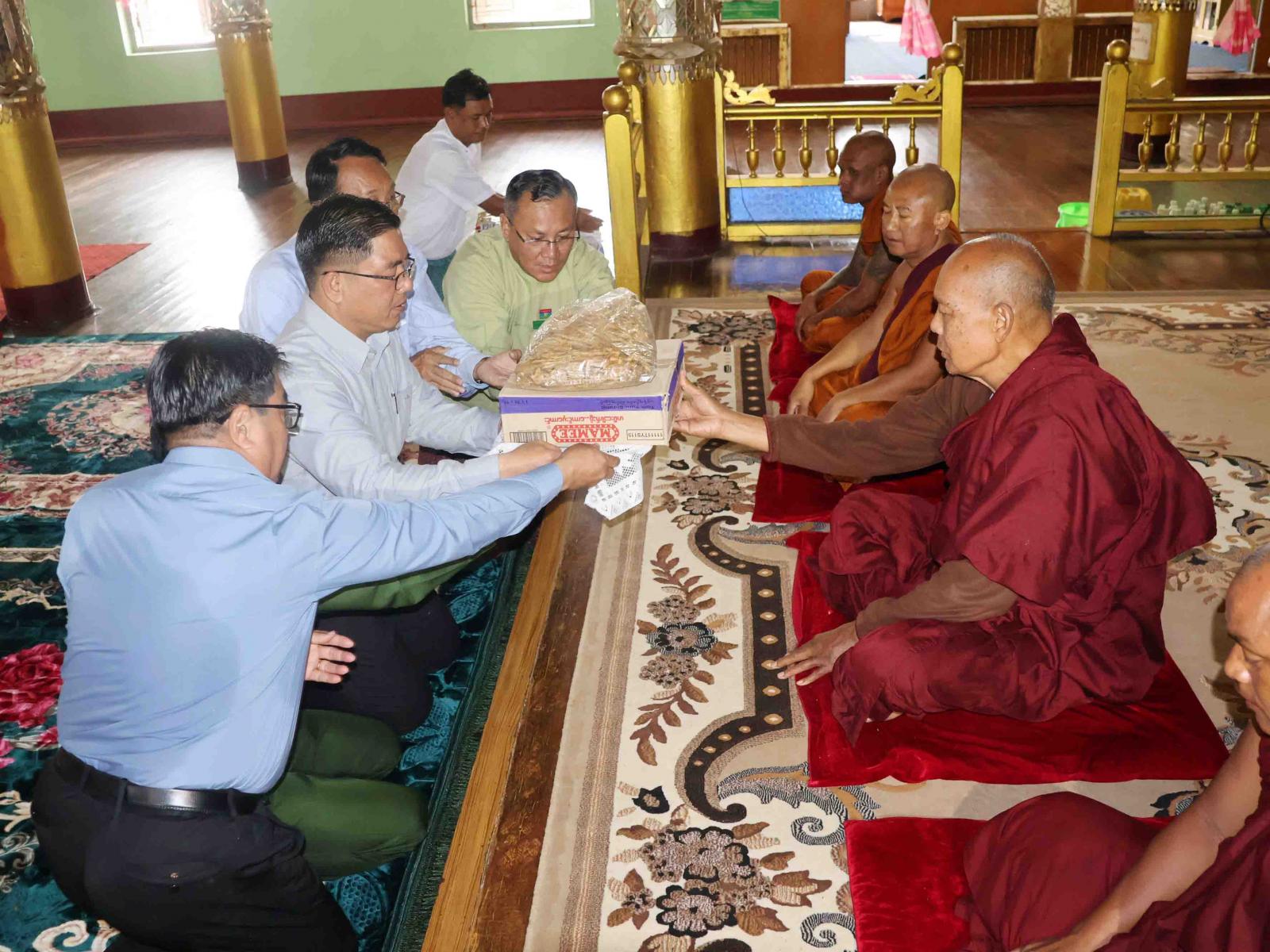 ဆက်လက်၍ ရွှေတောင်ရပ်ကွက်ရှိ ရွှေတောင်ပရိယတ္တိစာသင်တိုက်ရှိ ဆရာတော်များအား ဖူးမြော်ကြည်ညို၍ သာသနာရေးဆိုင်ရာများ လျှောက်ထားခြင်းနှင့် ဆွမ်းဆန်တော်၊ ဆီနှင့် လှူဖွယ်ဝတ္ထုပစ္စည်းများ ဆက်ကပ်လှူဒါန်းခဲ့ပြီး ဝန်ကြီးချုပ်က “ကျောင်းအတွင်း သောက်သုံးရေ၊ ထင်း၊ မီးသွေးနှင့် စက်သုံးဆီများ လှူဒါန်းရန်၊ ကျောင်းဝေယျာဝစ္စကိစ္စရပ်များ ဆောင်ရွက်ရန်အတွက် လှေတစ်စီးအား စီမံထားရန်နှင့် ရေများပြန်လည်ကျဆင်းပါက ကျောင်းဝန်းအတွင်း စုပေါင်းသန့်ရှင်းရေးဆောင်ရွက်ပေးရန်” တာဝန်ရှိသူများ အားမှာကြားခဲ့သည်။