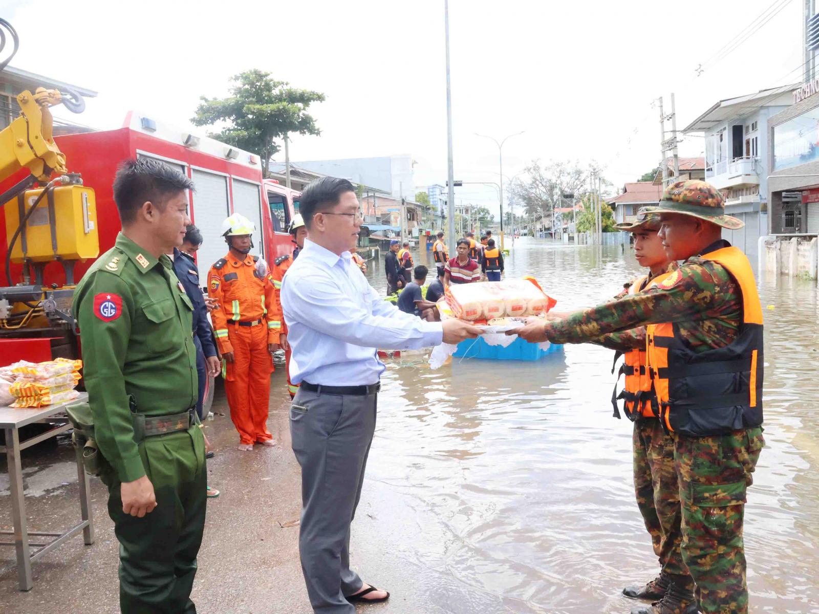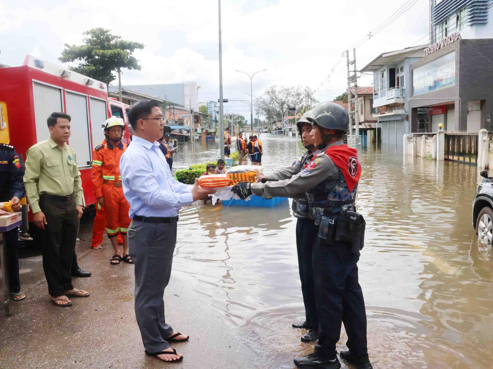 ထို့နောက် မင်းစု၊ ဓမ္မာရုံ၊ နမ့်ကွတ်ရပ်ကွက်များရှိ ရေဘေးသင့်ပြည်သူ အိမ်ထောင်စု (၉၈) စု၊ လူဦးရေ (၃၃၀) ဦးတို့အတွက် ဆန်၊ ဆီ၊ အဝတ်အထည်၊ စားသောက်ကုန်နှင့် လူသုံးကုန်ပစ္စည်းများ ထောက်ပံ့ပေးအပ်ပြီး ပြည်သူများက လိုအပ်ချက်များတင်ပြခဲ့ရာ တင်ပြချက်များအပေါ် ပြည်နယ်ဝန်ကြီးချုပ်က “လျှပ်စစ်မီးရရှိရေးနှင့် နေ့စဉ်ချက်ပြုတ်ရာတွင် ထင်း၊ မီးသွေးနှင့် လောင်စာဆီလိုအပ်ချက်များအတွက် အတတ်နိုင်ဆုံးဖြည့်ဆည်း ဆောင်ရွက်ပေးရန်၊ နေ့စဉ်ကျန်းမာရေးစောင့်ရှောက်မှုများနှင့် ကြိုတင်ကာကွယ်ရေးလုပ်ငန်းများ၊ အသိပညာပေးဟောပြောပွဲများ ဆောင်ရွက်ရန်” တို့ကိုတာဝန်ရှိသူများနှင့် ပေါင်းစပ်ညှိနှိုင်းပေးခဲ့ကာ ရေဘေးသင့်ပြည်သူများအား ရင်းရင်းနှီးနှီးနှုတ်ဆက်အားပေးစကား ပြောကြားခဲ့သည်။
