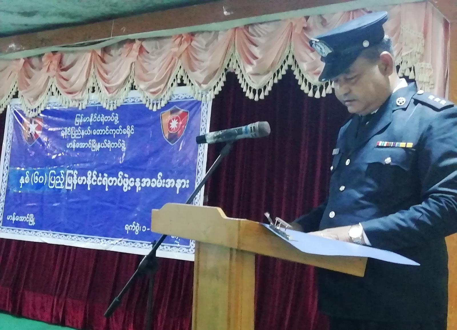 ရခိုင်ပြည်နယ်၊ တောင်ကုတ်ခရိုင်၊ မာန်အောင်မြို့၌ နှစ်(၆၀)ပြည့် မြန်မာနိုင်ငံရဲတပ်ဖွဲ့ နှစ်ပတ်လည်နေ့အခမ်းအနားကို ယမန်နေ့နံနက် ၉ နာရီက မြို့နယ်အထွေထွေအုပ်ချုပ်ရေးဦးစီးဌာန၊ အစည်းအဝေးခန်းမ၌ ကျင်းပပြုလုပ်ခဲ့သည်။