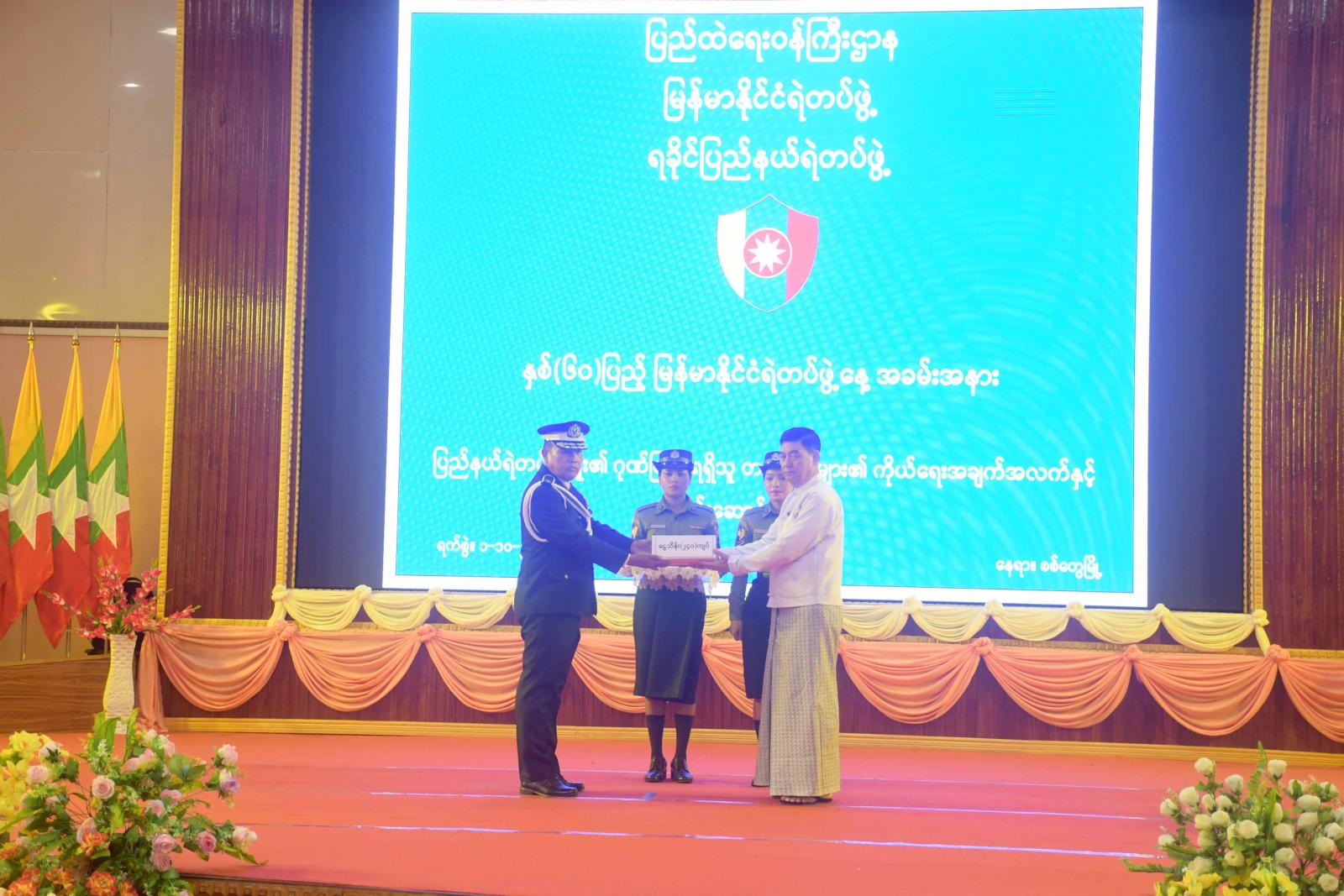 ဆက်လက်၍ နှစ်(၆၀)ပြည့် မြန်မာနိုင်ငံရဲတပ်နေ့အခမ်းအနားသို့ ရဲချုပ်မှပေးပို့သည့် သဝဏ်လွှာအား ရခိုင်ပြည်နယ်ရဲတပ်ဖွဲ့မှူး ရဲမှူးကြီးသက်လွင်က ဖတ်ကြားပြီး ပြည်နယ်ဝန်ကြီးချုပ်၊ ပြည်နယ်တရားလွှတ်တော်တရားသူကြီးချုပ်နှင့် တာဝန်ရှိသူများက မှုခင်းများဖော်ထုတ်၊ ဖမ်းဆီးရမိမှုများနှင့် တရားဥပဒေစိုးမိုးရေးလုပ်ငန်းများတွင် စွမ်းစွမ်းတမံဆောင်ရွက်ခဲ့ကြသည့် တပ်ဖွဲ့ဝင်များအား ဂုဏ်ပြုမှတ်တမ်းလွှာနှင့် ဂုဏ်ပြုဆုများပေးအပ်ချီးမြှင့်ကြသည်။ ယင်းနောက် မြန်မာနိုင်ငံရဲတပ်ဖွဲ့နေ့အထိမ်းအမှတ်(Video Clip) အားပြသပြီး စုပေါင်းမှတ်တမ်းတင်ဓာတ်ပုံ ရိုက်ကူးကြကာ ပြည်နယ်ဝန်ကြီးချုပ်နှင့် တာဝန်ရှိသူများက အထိမ်းအမှတ်ပြခန်းများအား လှည့်လည်ကြည့်ရှုခဲ့ကြသည်။