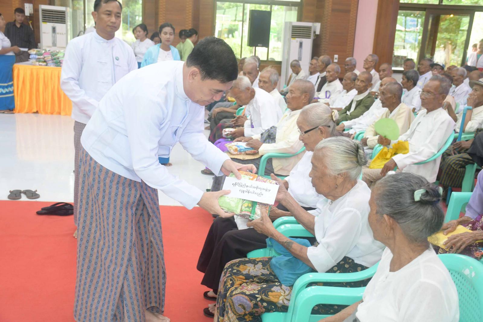 ထို့နောက် ပြည်နယ်ဝန်ကြီးချုပ် ဦးထိန်လင်းနှင့် ပြည်နယ်အစိုးရအဖွဲ့ဝင်များကဦးဆောင်ကာ သက်ကြီးဘိုးဘွားများအား ထောက်ပံ့ငွေနှင့် ဂုဏ်ပြုပစ္စည်းများပေးအပ်ကြသည်။