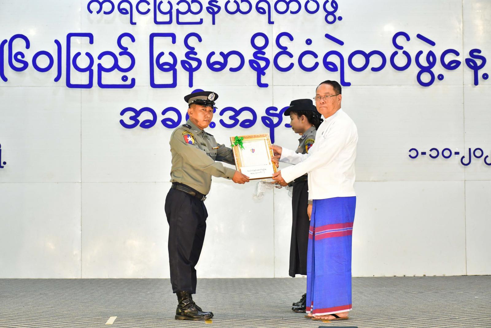 ထို့နောက် ကရင်ပြည်နယ်ရဲတပ်ဖွဲ့ ခေတ္တပြည်နယ်ရဲတပ်ဖွဲ့မှူးရဲမှူးကြီးဉာဏ်ဝင်းက မြန်မာနိုင်ငံ ရဲတပ်ဖွဲ့ဌာနချုပ်၊ ရဲချုပ်၏သဝဏ်လွှာကို ဖတ်ကြားပြီး ပြည်နယ်ဝန်ကြီးချုပ်၊ အရှေ့တောင်တိုင်း စစ်ဌာနချုပ်ဒုတိယတိုင်းမှူး၊ ပြည်နယ် တရားလွှတ်တော်တရားသူကြီးချုပ်၊ ပြည်နယ်အစိုးရအဖွဲ့ဝင်များက ထူးချွန်ဆုရရဲတပ်ဖွဲ့ဝင်များအား ဂုဏ်ပြုဆုများ ပေးအပ်ချီးမြှင့်ကာ တက်ရောက်လာသူများနှင့်အတူ မြန်မာနိုင်ငံရဲတပ်ဖွဲ့နေ့အထိမ်းအမှတ် Video Clip ကို အတူတကွကြည့်ရှုခဲ့ကြသည်။