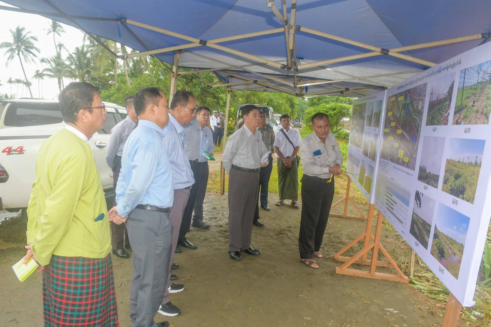 ထို့နောက် ပြည်နယ်ဝန်ကြီးချုပ်နှင့်အဖွဲ့သည် စစ်တွေလေဆိပ်တွင် ပျက်စီးနေသော ခြံစည်းရိုးများအား ပြုပြင်နေမှုကို သွားရောက်ကြည့်ရှုစစ်ဆေးရာ ဆောက်လုပ်ရေးတာဝန်ခံက လုပ်ငန်းဆောင်ရွက်နေမှုနှင့် ဆက်လက်ဆောင်ရွက်ရမည့် အခြေအနေများကို ရှင်းလင်းတင်ပြသည်။ တင်ပြချက်များအပေါ် ပြည်နယ်အစိုးရအဖွဲ့ဝင်များက ဖြည့်စွက်အကြံပြုဆွေးနွေးတင်ပြကြရာ ပြည်နယ်ဝန်ကြီးချုပ်က လုပ်ငန်းများ အမြန်ဆုံးပြီးစီးနိုင်ရေးနှင့် သတ်မှတ်စံချိန်စံညွှန်း ကိုက်ညီနိုင်ရေးလုပ်ဆောင်သွားရန် မှာကြားခဲ့သည်။
