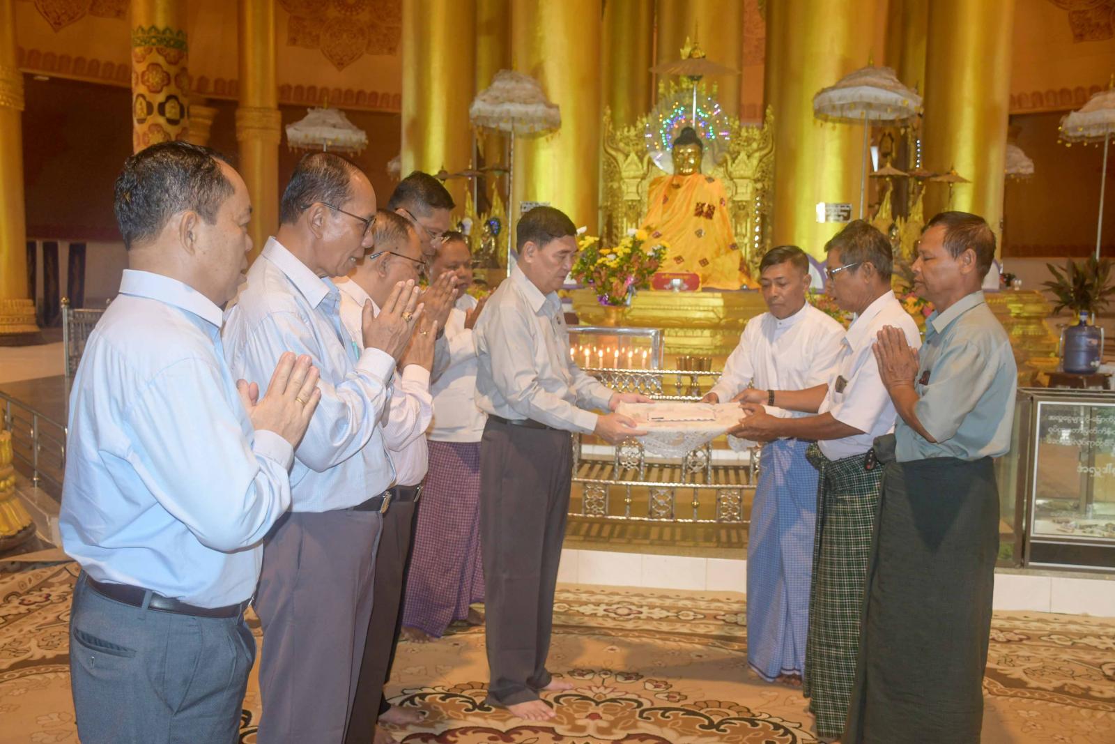 ဦးစွာ ပြည်နယ်ဝန်ကြီးချုပ်နှင့်အဖွဲ့သည် လောကာနန္ဒာစေတီတော်မြတ်ကြီးအတွင်းရှိ ဗုဒ္ဓရုပ်ပွားတော်မြတ်များနှင့် ရှေးဟောင်းသမိုင်း အောင်စကြာမုနိဘုရားအားဖူးမြော်ကြည်ညိုကာ ပန်း၊ ဆီမီး၊ ရေချမ်းများဆက်ကပ်လှူဒါန်းကြပြီး စေတီတော်မြတ်ကြီး ဘက်စုံပြုပြင်နိုင်ရန်နှင့် အောင်စကြာမုနိသိမ်တော် ဘက်စုံပြုပြင်နိုင်ရန်အတွက် အလှူငွေများ ထည့်ဝင်လှူဒါန်းကြသည်။