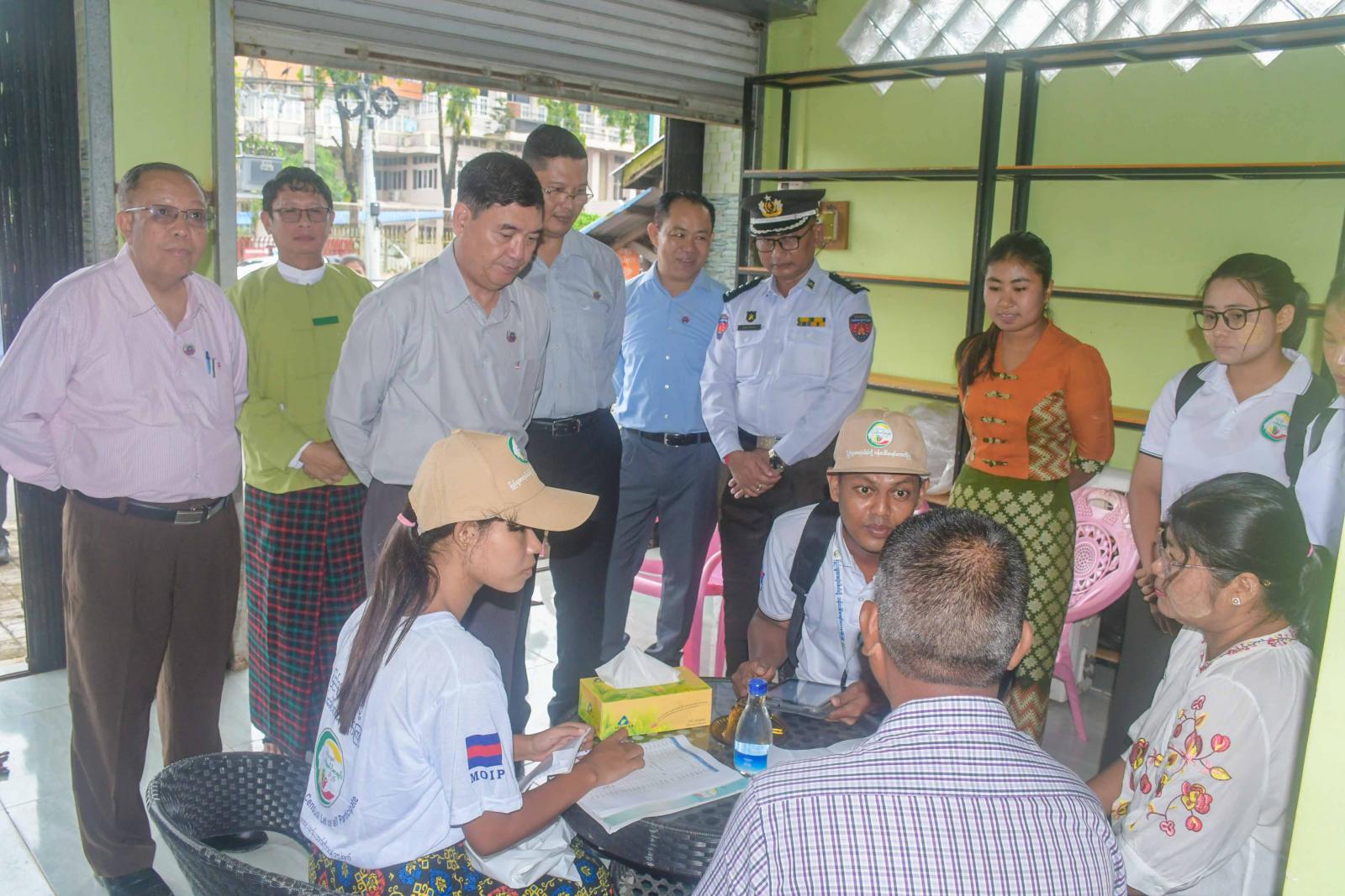 ထို့နောက် ပြည်နယ်ဝန်ကြီးချုပ်နှင့်အဖွဲ့သည် စစ်တွေမြို့၊ ဘောလုံးကွင်းရပ်ကွက်တွင် ၂၀၂၄ ခုနှစ်၊ လူဦးရေနှင့်အိမ်အကြောင်းအရာ သန်းခေါင်စာရင်းကောက်ယူရေးအဖွဲ့များက အိမ်တိုင်ရာရောက် သန်းခေါင်းစာရင်း ကောက်ယူနေမှုကို လှည့်လည်ကြည့်ရှုအားပေးကြသည်။