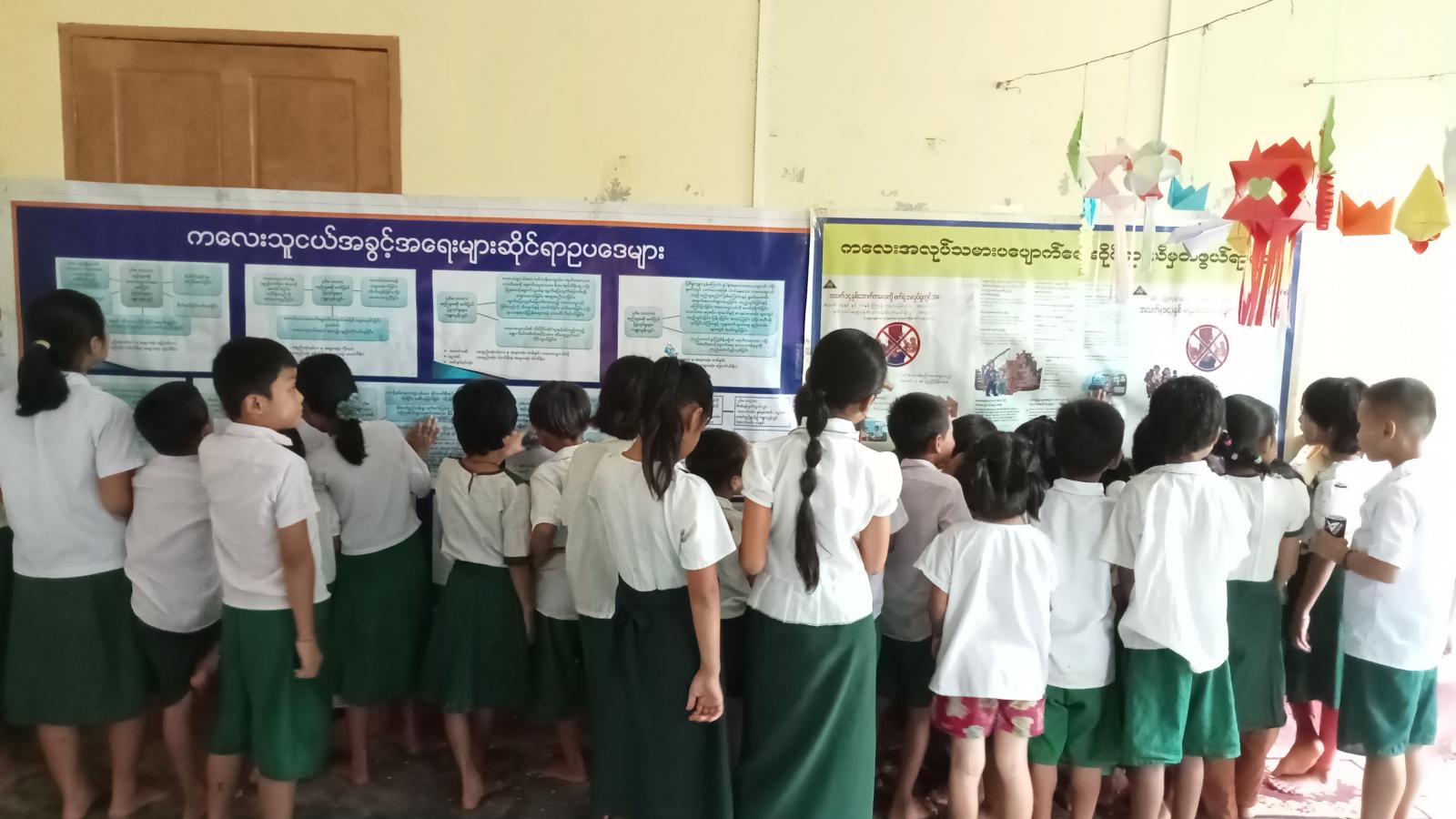 ထို့နောက် ကလေးအလုပ်သမားနှင့်ပတ်သက်၍ အသိပညာပေးအကြောင်းအရာများ၊ ကလေးသူငယ်အခွင့်အရေးများဆိုင်ရာ သိကောင်းစရာများပါဝင်သော အသိပညာပေးနံရံကပ်စာစောင်များကို ပြသဆောင်ရွက်ထားရာ ကျောင်းသား၊ ကျောင်းသူကလေးငယ်များက စိတ်ဝင်စားစွာကြည့်ရှုလေ့လာမှတ်သားခဲ့ကြောင်း သိရသည်။