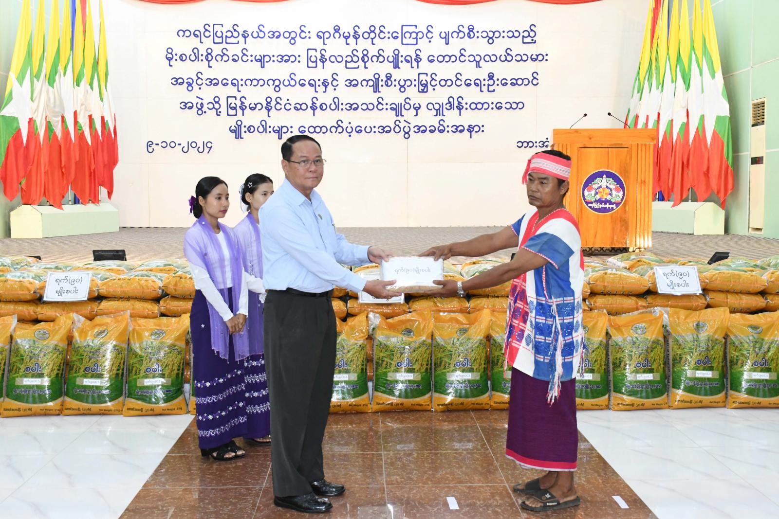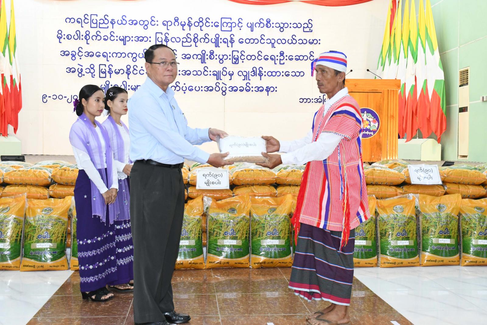ရာဂီမုန်တိုင်းတိုက်ခတ်ခဲ့သည့်အရှိန်ကြောင့် မြစ်ရေချောင်းရေများရေစံချိန်တင်မြင့်တက်ခဲ့ပြီး ရေကြီးရေလျှံမှုများဖြစ်ပေါ်ခဲ့ရာ ပြည်နယ်အတွင်းစိုက်ပျိုးပြီးမိုးစပါးဧက (၃၅၃၉၁) ဧက ရေနစ်မြုပ်၍ ရေပြန်ကျချိန်တွင် (၃၁၂၉၆) ဧက ထိခိုက်ကာ (၁၄၄၆၁) ဧက ဒုတိယအကြိမ်ထပ်မံပျက်စီးခဲ့ရသည့်အတွက် ယနေ့အခမ်းအနားတွင် ပြည်နယ်ဝန်ကြီးချုပ်၊ ပြည်နယ်တရားလွှတ်တော်တရားသူကြီးချုပ်၊ ပြည်နယ်အစိုးရအဖွဲ့ဝင်များက မြန်မာနိုင်ငံဆန်စပါးအသင်းချုပ်မှကရင်ပြည်နယ် တောင်သူလယ်သမားအခွင့်အရေးကာကွယ်ရေးနှင့် အကျိုးစီးပွားမြှင့်တင်ရေးလုပ်ငန်းအဖွဲ့သို့ လှူဒါန်းသည့် ဘားအံမြို့နယ်အတွက် ရက် (၉၀) မျိုးစပါး ၄၁၉၇ တင်း၊ လှိုင်းဘွဲမြို့နယ်အတွက် ၁၈၀၀ တင်း၊ ဖာပွန်မြို့နယ် ၁၁ တင်း စုစုပေါင်း မျိုးစပါး ၅၉၈၆ တင်းကို တောင်သူများအား ထောက်ပံ့ပေးအပ်ခဲ့ကြရာ တောင်သူတစ်ဦးက ကျေးဇူးတင်စကားပြန်လည်ပြောကြားသည်။