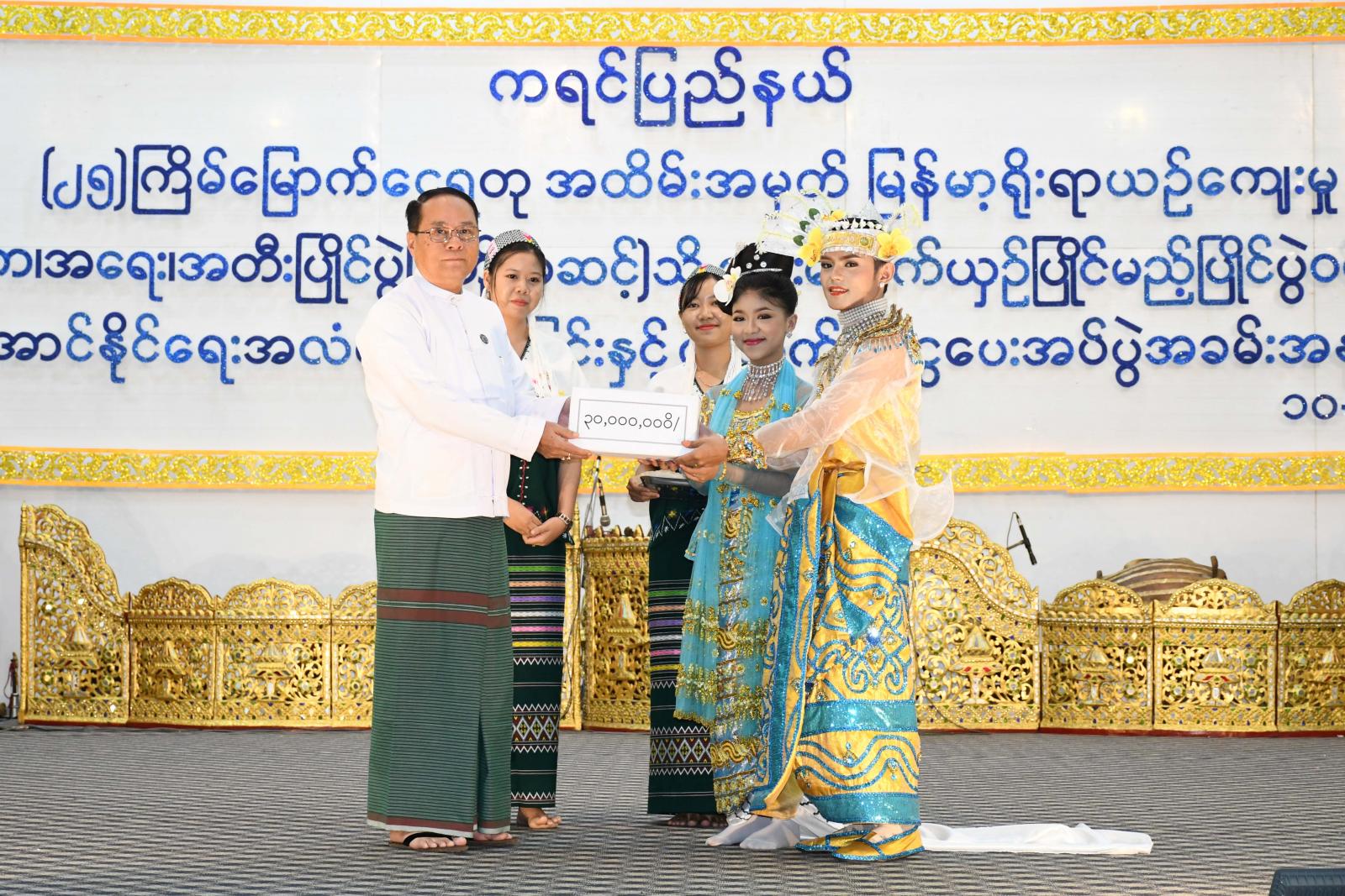 ဦးစွာ ကရင်ပြည်နယ်ဝန်ကြီးချုပ်ဦးစောမြင့်ဦးက၂၀၂၃ ခုနှစ်(၂၄)ကြိမ်မြောက် မြန်မာ့ရိုးရာယဉ်ကျေးမှု အဆို၊ အက၊ အရေး၊ အတီး ပြိုင်ပွဲတွင် ကရင်ပြည်နယ်အနေဖြင့် ဆုတံဆိပ်များစွာ ဆွတ်ခူးရရှိစေရေး ပြိုင်ပွဲဝင်များအနေဖြင့် ကိုယ်စွမ်း၊ ဉာဏ်စွမ်းရှိသမျှ အားသွန်ခွန်စိုက်ကြိုးစားယှဉ်ပြိုင်သွားကြရန် တိုက်တွန်းပြောကြားပြီး အောင်နိုင်ရေးအလံနှင့် ထောက်ပံ့ငွေကျပ်သိန်း (၃၀၀) ကို တာဝန်ရှိသူများထံချီးမြှင့်ပေးအပ်သည်။