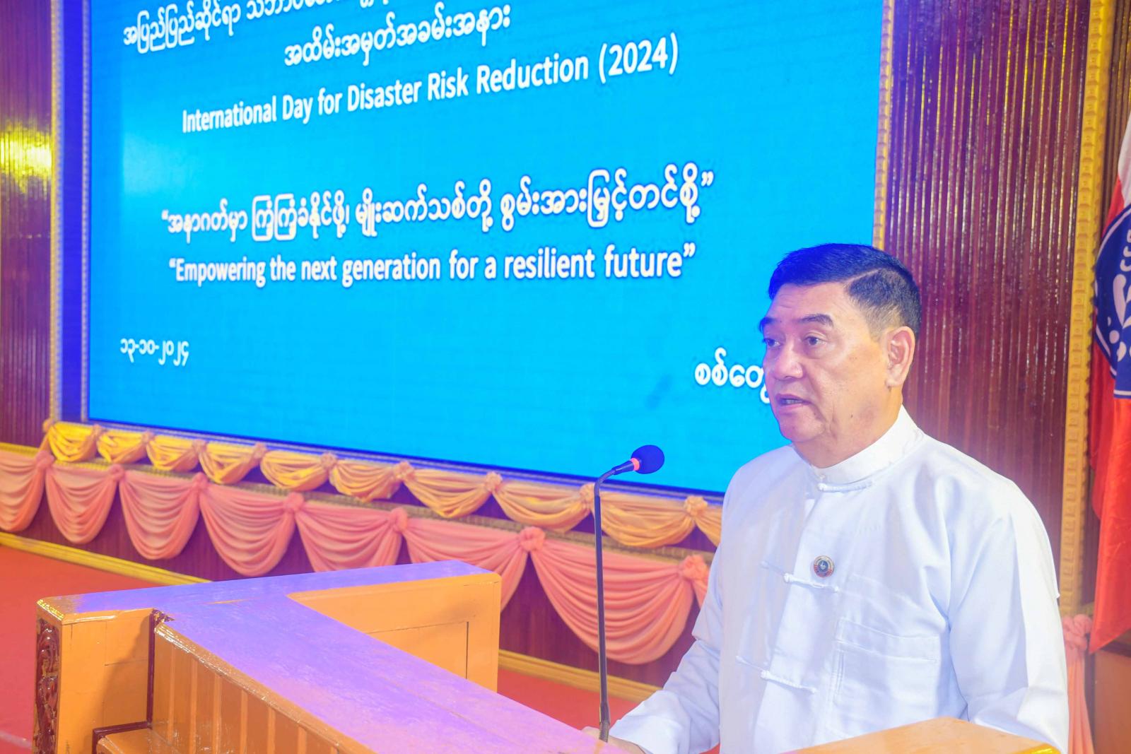 အခမ်းအနားတွင် ရခိုင်ပြည်နယ်သဘာဝဘေးအန္တရာယ်ဆိုင်ရာစီမံခန့်ခွဲမှုအဖွဲ့ဥက္ကဋ္ဌ၊ ပြည်နယ်ဝန်ကြီးချုပ် ဦးထိန်လင်းက ၂၀၀၉ ခုနှစ်၊ ဒီဇင်ဘာလ(၂၁) ရက်နေ့တွင်ကျင်းပခဲ့သည့် ကုလသမဂ္ဂအထွေထွေညီလာခံ၏ ဆုံးဖြတ်ချက်ဖြင့် အောက်တိုဘာလ(၁၃)ရက်နေ့ကို အပြည်ပြည်ဆိုင်ရာသဘာဝဘေးအန္တရာယ်ထိခိုက်ဆုံးရှုံးနိုင်ခြေလျှော့ချရေးနေ့အဖြစ် သတ်မှတ်ခဲ့ပြီး အထိမ်းအမှတ်အခမ်းအနားများကို ကမ္ဘာ့နိုင်ငံအသီးသီးတွင် နှစ်စဉ်ကျင်းပလျက်ရှိကြောင်း၊ မိမိတို့နိုင်ငံတွင်လည်း အထိမ်းအမှတ်အခမ်းအနားကို ၂၀၁၀ ပြည့်နှစ်ကစတင်ပြီး နိုင်ငံတော်အဆင့်အခမ်းအနား တစ်ရပ်အနေဖြင့် နှစ်စဉ်ကျင်းပခဲ့ကြောင်း၊ ထိုသို့ကျင်းပရာတွင် ကုလသမဂ္ဂအပြည်ပြည်ဆိုင်ရာ သဘာဝဘေးအန္တရာယ် ထိခိုက်ဆုံးရှုံးနိုင်ခြေလျှော့ချရေးရုံး(United Nations Office For Disaster Risk Reduction – UNDRR)က နှစ်စဉ်ဦးတည်အုပ်စုတစ်စုကိုရွေးချယ်ပြီး သတ်မှတ်သည့် ဆောင်ပုဒ်များအတိုင်း ကျင်းပခဲ့ကြကြောင်း၊ ယခုနှစ်ကျရောက်သည့် အပြည်ပြည်ဆိုင်ရာ သဘာဝဘေးအန္တရာယ်ထိခိုက် ဆုံးရှုံးနိုင်ခြေလျှော့ချရေးနေ့အတွက် သတ်မှတ်ထားသည့် ဆောင်ပုဒ်မှာ “အနာဂတ်မှာ ကြံ့ကြံ့ခံနိုင်ဖို့ မျိုးဆက်သစ်တို့ စွမ်းအားမြှင့်တင်စို့”ဖြစ်ကြောင်း၊ ကမ္ဘာ့နိုင်ငံများတွင် ကမ္ဘာကြီးပူနွေးလာမှုနှင့် ရာသီဥတုပြောင်းလဲဖောက်ပြန်မှုတို့၏ ဆိုးကျိုးသက်ရောက်မှုများကို ရင်ဆိုင်တွေ့ကြုံခံစားနေရကြောင်း၊ မိမိတို့ကိုယ်တိုင်းလည်း ၂၀၂၃ ခုနှစ်တွင် အလွန့်အလွန်အားကောင်းသည့် ဆိုင်ကလုန်းမုန်တိုင်း မိုခါ၏ တိုက်ခတ်မှုဒဏ်ကို ကိုယ်တိုင် ကြုံတွေ့ခံစားခဲ့ရပြီးဖြစ်ကြောင်း၊ ယခုနှစ်တွင်လည်း ရေကြီးရေလျှံမှုများကို မြန်မာနိုင်ငံအနှံ့တွင် ရင်ဆိုင်ကြုံတွေ့နေကြရကြောင်း၊ သဘာဝဘေးအန္တရာယ်ဆိုသည်မှာ နိုင်ငံတစ်နိုင်ငံ၏ စဉ်ဆက်မပြတ် ဖွံ့ဖြိုးတိုးတက်ရေးလုပ်ငန်းများကို အဟန့်အတားဖြစ်စေသည့် အဓိကစိန်ခေါ်မှုတစ်ရပ်ဖြစ်သည့်အတွက် ဖွံ့ဖြိုးတိုးတက်ရေး မဟာဗျူဟာလုပ်ငန်းစဉ်များ၊ စီမံကိန်းများတွင် သဘာဝဘေးအန္တရာယ် လျှော့ပါးရေးလုပ်ငန်းစဉ်များ ပေါင်းစပ်ထည့်သွင်း ဆောင်ရွက်သွားကြရန်လိုကြောင်း၊ သဘာဝဘေး အန္တရာယ်များ ကျရောက်ဖြစ်ပွားသည့်အခါ ဖြစ်ပွားရာဒေသရှိ ရပ်ရွာလူထုသည် ပထမဦးဆုံးရင်ဆိုင် ဖြေရှင်းရသူများဖြစ်ကြပြီး စီမံတုံ့ပြန်ဆောင်ရွက်ရသည်မှာ ဒေသခံအစိုးရများဖြစ်ကြောင်း၊ ထို့ကြောင့် မျိုးဆက်သစ်များ သဘာဝဘေးအန္တရာယ်စီမံခန့်ခွဲမှုဆိုင်ရာ အသိပညာများကို သိရှိနားလည်ပြီး စေတနာ့ဝန်ထမ်းစိတ်ဓာတ်အခြေခံကောင်းများဖြင့် မိမိတို့နေထိုင်ရာပတ်ဝန်းကျင်တွင် ဘေးအန္တရာယ်များကျရောက်ဖြစ်ပွားလာပါက မိမိကိုယ်တိုင်သာမက အများအကျိုး
