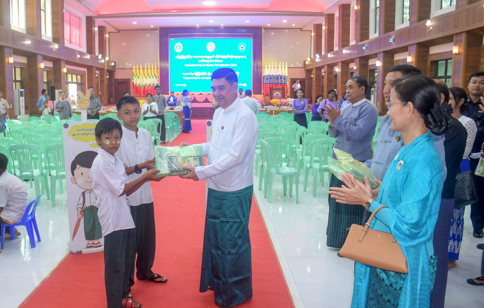 ထို့နောက် ပြည်နယ်ဝန်ကြီးချုပ်နှင့်ဇနီးတာဝန်ရှိသူများသည် အခမ်းအနားသို့ တက်ရောက် လာကြသူများအား ရင်းရင်းနှီးနှီးတွေ့ဆုံနှုတ်ဆက်ကြပြီး အပြည်ပြည်ဆိုင်ရာ သဘာဝဘေးထိခိုက် ဆုံးရှုံးနိုင်ခြေလျှော့ချရေးနေ့အထိမ်းအမှတ် ကျောင်းသား၊ ကျောင်းသူများ၏ သဘာဝဘေးအန္တရာယ်ဆိုင်ရာ အသိပညာပေးဂိမ်းကစားနေမှုကို လှည့်လည်ကြည့်ရှုအားပေးကြသည်။