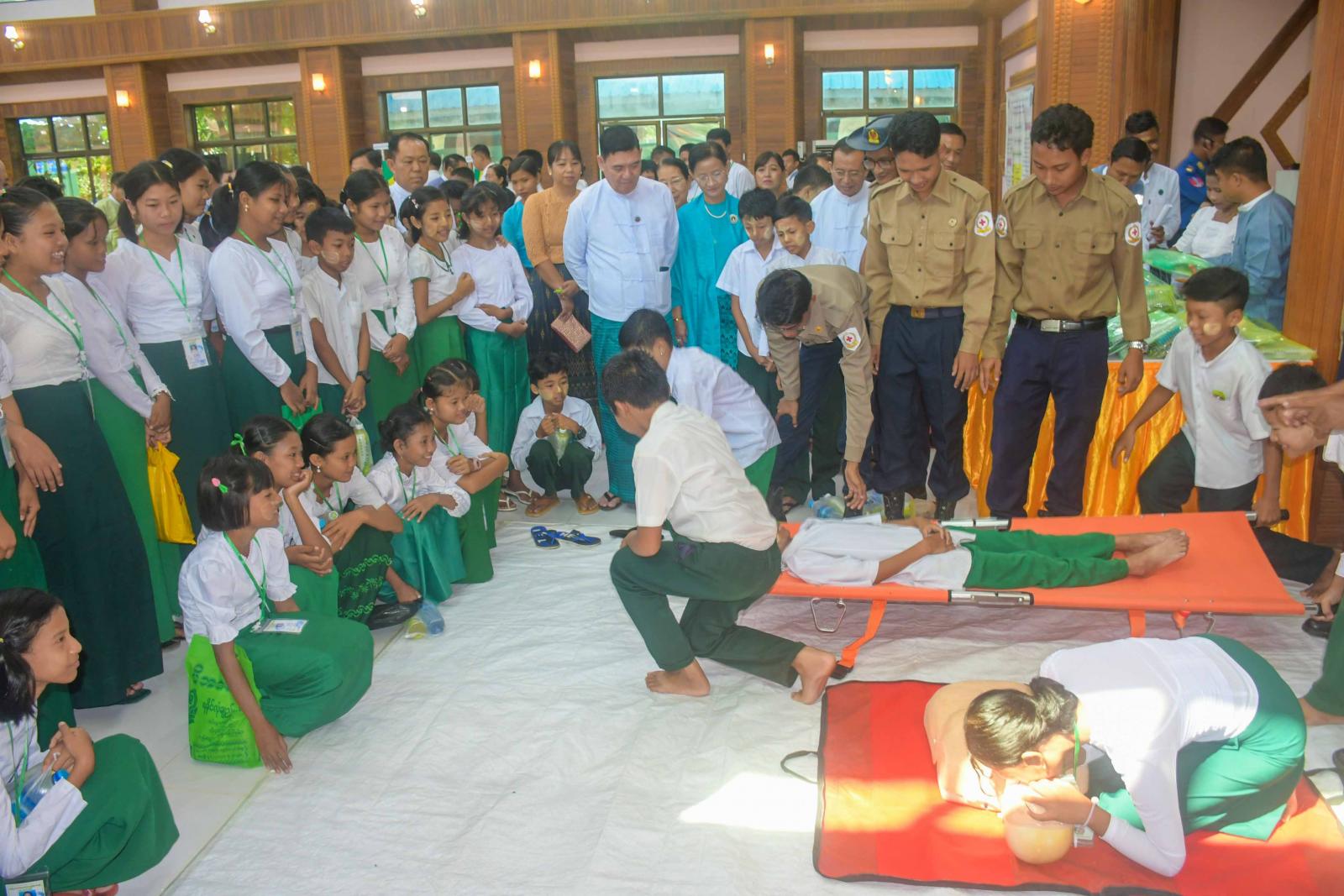 ယင်းနောက် ပြည်နယ်ဝန်ကြီးချုပ်နှင့်ဇနီးတာဝန်ရှိသူများသည် မြန်မာနိုင်ငံကြက်ခြေနီတပ်ဖွဲ့ဝင်များက ကျောင်းသား၊ ကျောင်းသူများအား အရေးပေါ်ရှေးဦးသူနာပြုစုနည်း သရုပ်ပြသခြင်းနှင့် လေ့ကျင့်ခြင်းများ ဆောင်ရွက်နေမှုကို လှည့်လည်ကြည့်ရှုအားပေးကြကာ ကျောင်းသား၊ ကျောင်းသူများအား အမှတ်တရလက်ဆောင်ပစ္စည်းများ ပေးအပ်ချီးမြှင့်ခဲ့ကြကြောင်း သတင်းရရှိသည်။