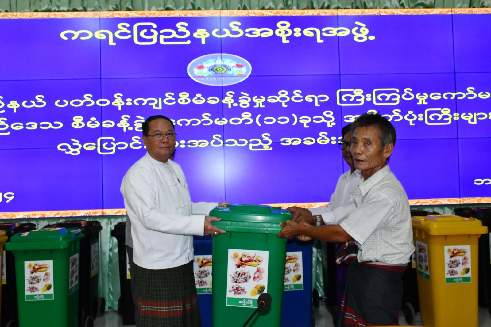 ဆက်လက်၍ ကရင်ပြည်နယ်အစိုးရအဖွဲ့၏ ဦးဆောင်မှုဖြင့် ကရင်ပြည်နယ်ပတ်ဝန်းကျင် စီမံခန့်ခွဲမှုဆိုင်ရာကြီးကြပ်မှုကော်မတီမှ ခရီးစဉ်ဒေသစီမံခန့်ခွဲမှုကော်မတီ(၁၁)ခုသို့ အမှိုက်ပုံးကြီး (၂၂) ပုံးအား လွှဲပြောင်းပေးအပ်သည့် အခမ်းအနားကို နံနက် ၁၀ နာရီခွဲက ပြည်နယ်အစိုးရအဖွဲ့ရုံး အစည်းအဝေးခန်းမ(၂)၌ ကျင်းပရာ ပြည်နယ်ဝန်ကြီးချုပ်က အမှာစကားပြောကြားပြီး ပြည်နယ်ဝန်ကြီးချုပ်၊ အရှေ့တောင်တိုင်းစစ်ဌာနချုပ်ဒုတိယတိုင်းမှူး၊ ပြည်နယ်တရား လွှတ်တော်တရားသူကြီးချုပ်၊ ပြည်နယ်အစိုးရအဖွဲ့ဝင်များနှင့်တာဝန်ရှိသူများက ဆဒ္ဒန်ဂူ၊ ကော့ဂွန်းဂူ၊ ရသေ့ပျံဂူ၊ ကော့ကသောင်ဂူ၊ လွန်းညရေပြာအိုင်၊ ဇွဲကပင်တောင်၊ ကျောက်ကလပ်၊ တောင်ဝိုင်းတောင်၊ ကျုံထော်ရေတံခွန်၊ ဖောင်တော်ဦး၊ ပဒုမ္မာဂူ ခရီးစဉ်ဒေသစီမံခန့်ခွဲမှု ကော်မတီ(၁၁)ခုသို့ ငွေကျပ် (၂၄)သိန်း(၅)သောင်းတန်ဖိုးရှိ အမှိုက်ပုံးကြီးများကို လွှဲပြောင်းပေးအပ်ခဲ့ကြရာ ခရီးစဉ်ဒေသစီမံခန့်ခွဲမှုကော်မတီဥက္ကဋ္ဌ ခရိုင်အထွေထွေအုပ်ချုပ်ရေးမှူး ဦးအောင်လွင်က ကျေးဇူးတင်စကား ပြန်လည်ပြောကြားခဲ့ကြောင်း သတင်းရရှိသည်။