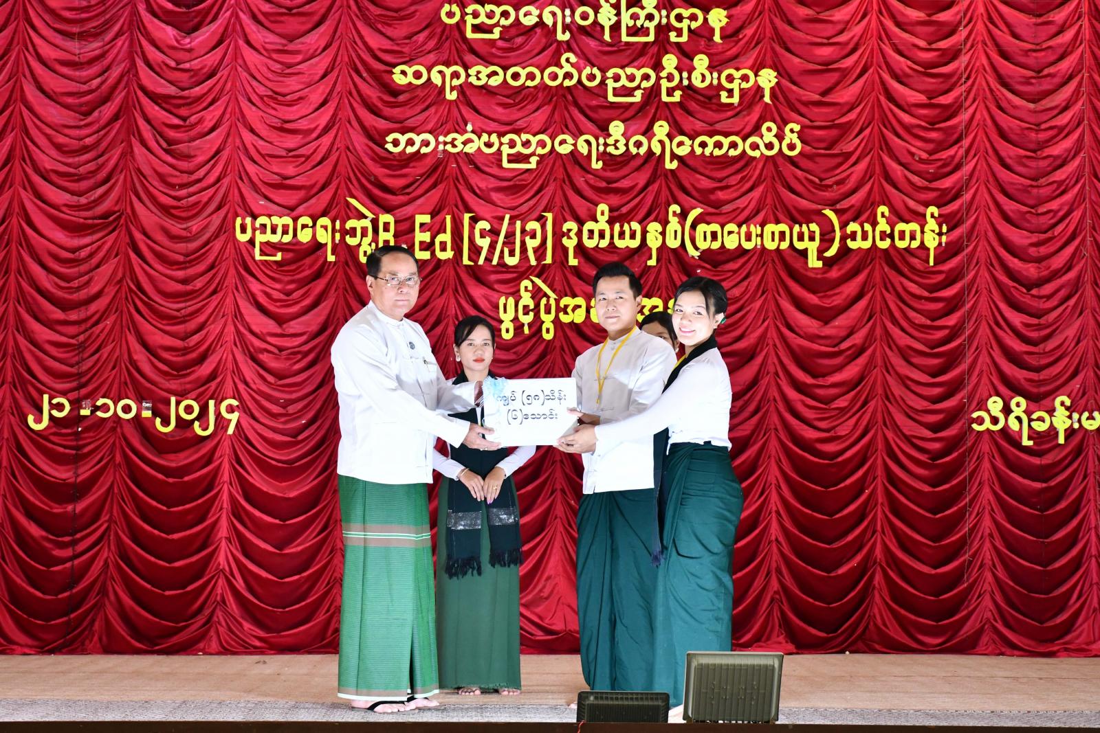 ဆက်လက်၍ ပညာရေးဝန်ကြီးဌာန၊ ဘားအံပညာရေးဒီဂရီကောလိပ်၊ ပညာရေးဘွဲ့ B.Ed(၄/၂၃)ဒုတိယနှစ် (စာပေးစာယူ)သင်တန်းဖွင့်ပွဲကို မွန်းလွဲ(၂)နာရီက အဆိုပါဒီဂရီကောလိပ် သီရိခန်းမ၌ကျင်းပရာ ပြည်နယ်ဝန်ကြီးချုပ်က အဖွင့်အမှာစကားပြောကြားပြီး သင်တန်းသား၊ သင်တန်းသူ ၂၉၃ ဦးအတွက် ငွေကျပ် ၅၈၆၀၀၀ဝိ/-(ကျပ်ငါးဆယ့်ရှစ်သိန်းခြောက်သောင်း)ကို ထောက်ပံ့ပေးအပ်ကာ ကျောင်းအုပ်ဆရာမကြီးဒေါ်အေးအေးမြင့်က သင်တန်းဆိုင်ရာများကို ရှင်းလင်းတင်ပြသည်။
