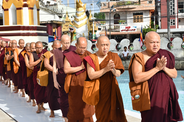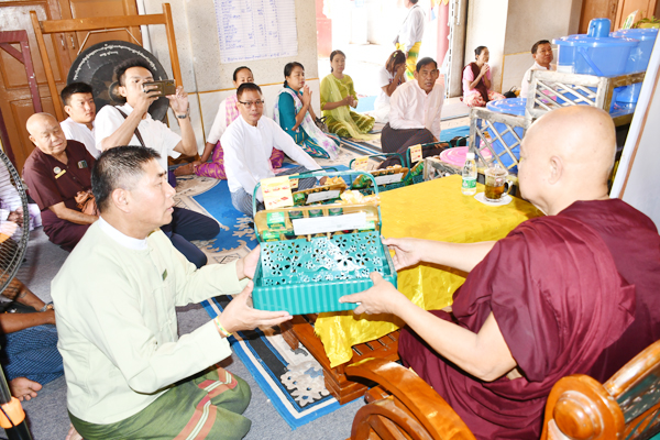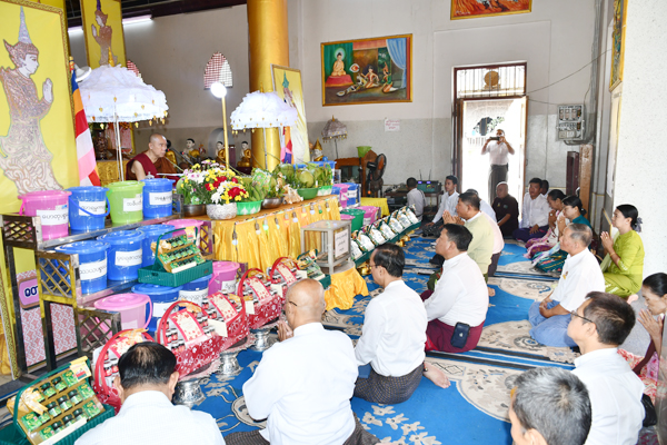 ဆက်လက်၍ မြို့နယ်သံယာ့နာယက အကျိုးတော်ဆောင် သင်္ယန်းညီနောင် သက်သက်လွတ် ကျောင်းတိုက်ဆရာတော် မဟာသဒ္ဓမ္မဇောတိကဓဇ ဘဒ္ဒန္တအာသီသက ရောင်ခြည်တော်ဖွင့် ဂါထာဖြင့် ပင်လျှောက်ပူဇော်ခြင်း၊ မြို့နယ်သံယာ့နာယကအဖွဲ့ဝင် သမုဂ္ဂသုခသီရိမြိုင်ကျောင်းတိုက် ဆရာတော်ဘဒ္ဒန္တဇောတိကဓဇက နတ်ဗြဟ္မာများအား ဖိတ်ကြားခြင်းတို့ကိုဆောင်ရွက်ပေးပြီး နိုင်ငံတော်ဗဟိုသံဃာ့ဝန်ဆောင် မြဝတီမြို့၊ မြသုခ၊ အမှတ်(၂၇၅) တပ်ဦးကျောင်းတိုက်ဆရာတော် အဂ္ဂမဟာသဒ္ဓမ္မဇောတိကဓဇ မဟာဂန္တ ဝါစကပဏ္ဍိတဘဒ္ဒန္တဒေါက်တာအရှင်ပညာနန္ဒထံမှ မြဝတီခရိုင်စီမံအုပ်ချုပ်ရေးအဖွဲ့မှအဖွဲ့ဝင်(၂)ဦးစိန်သောင်း၊ မြို့နယ်စီမံအုပ်ချုပ်ရေးအဖွဲ့ဥက္ကဋ္ဌ မြို့နယ်အုပ်ချုပ်ရေးမှူး ဦးသက်လွင်၊ ခရိုင်နှင့်မြို့နယ်အဆင့်ဌာနဆိုင်ရာ တာဝန်ရှိသူများနှင့် ဧည့်ပရိသတ်အပေါင်းတို့က ငါးပါးသီလခံယူဆောက်တည်ကြသည်။