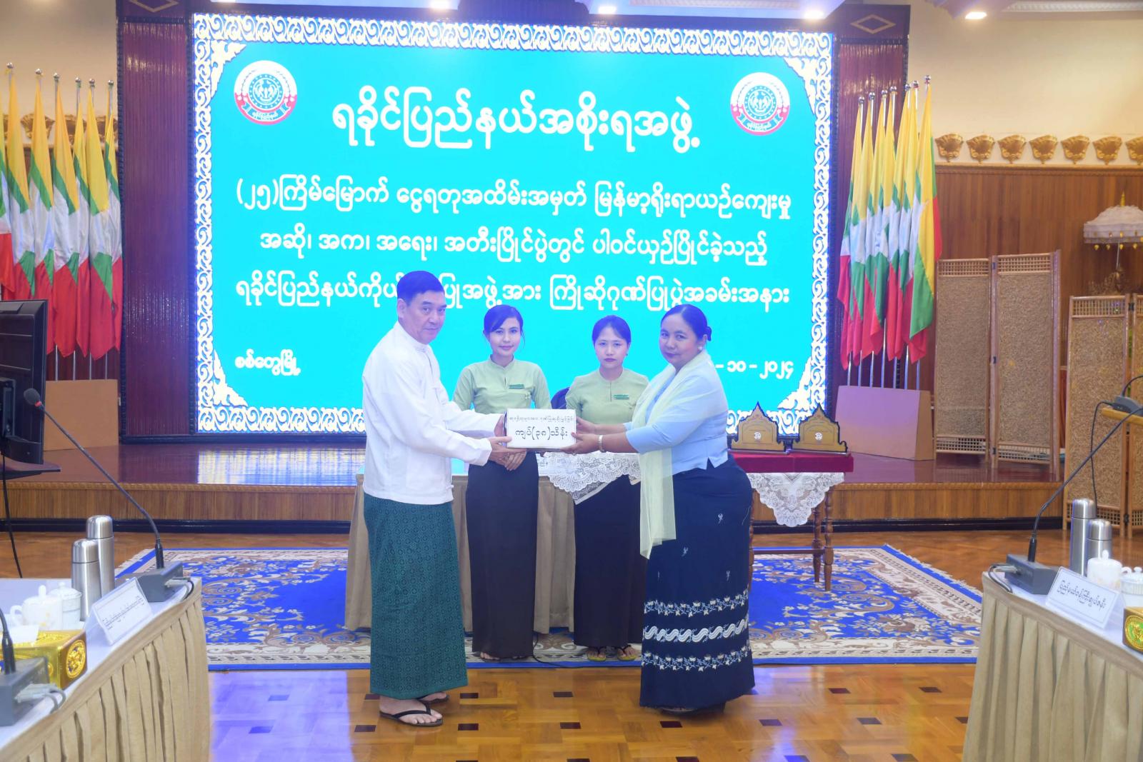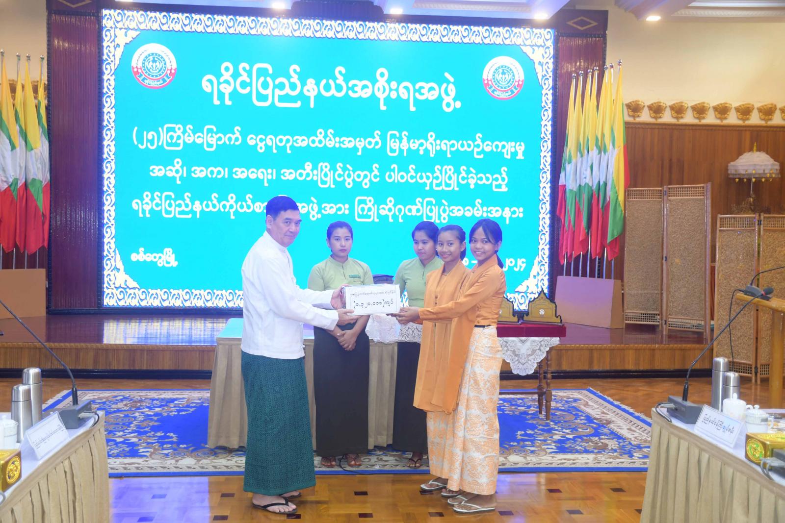ဆက်လက်၍ အောင်နိုင်ရေးလုပ်ငန်းကော်မတီဥက္ကဋ္ဌ၊ ပြည်နယ်လူမှုရေးရာဝန်ကြီးက ဗဟိုအဆင့်သို့သွားရောက်ယှဉ်ပြိုင်ခဲ့သည့် အတွေ့အကြုံများနှင့်ပတ်သက်၍ ရှင်းလင်းတင်ပြပြီး (၂၅) ကြိမ်မြောက် ငွေရတုအထိမ်းအမှတ် မြန်မာ့ရိုးရာယဉ်ကျေးမှု အဆို၊ အက၊ အရေး၊ အတီးပြိုင်ပွဲ ဆုချီးမြှင့်ပွဲအခမ်းအနားတွင် ရက္ခပူရရခိုင်ရိုးရာတူရိယာတေးဂီတအဖွဲ့မှ ဖျော်ဖြေခဲ့မှုဗီဒီယိုမှတ်တမ်းနှင့် ပြိုင်ပွဲများတွင် ရခိုင်ပြည်နယ်မှ ပါဝင်ယှဉ်ပြိုင်ခဲ့မှု မှတ်တမ်းဗီဒီယိုများအား ပြသခဲ့သည်။