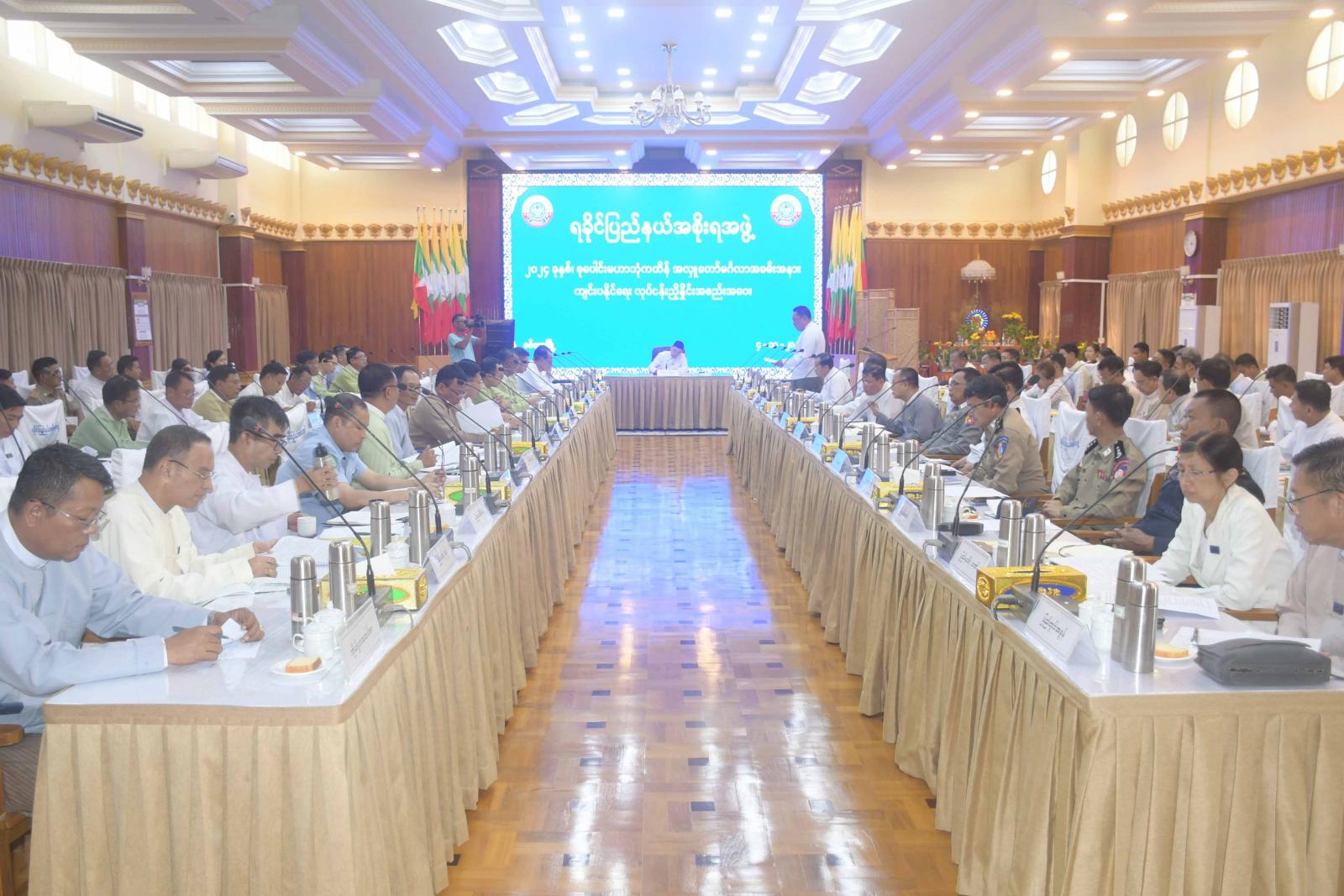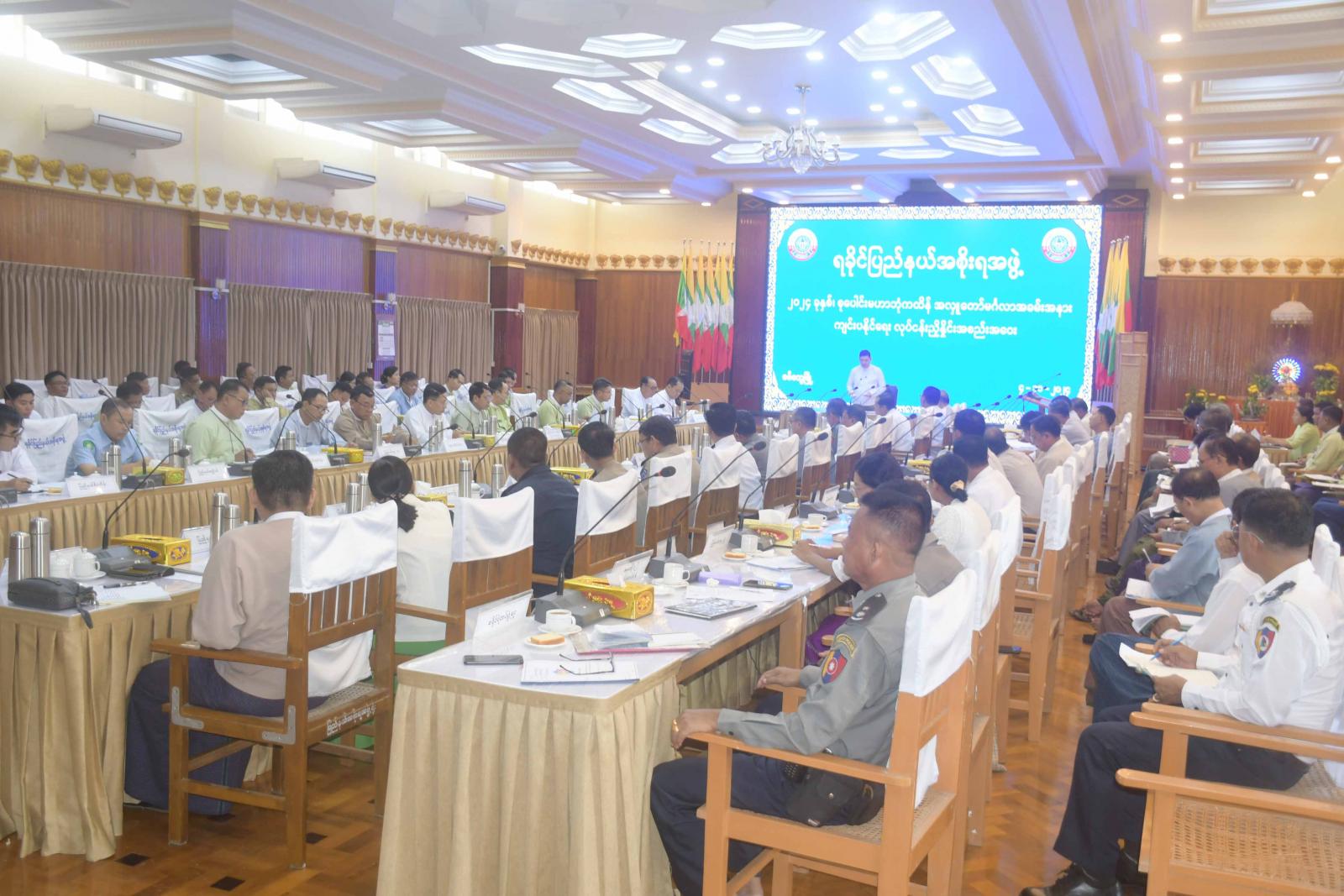 ရခိုင်ပြည်နယ်အစိုးရအဖွဲ့နှင့် ဌာနဆိုင်ရာများ စုပေါင်းမဟာဘုံကထိန်အလှူတော် မင်္ဂလာအခမ်းအနား အောင်မြင်စွာကျင်းပနိုင်ရေးအတွက် ဦးစီးကော်မတီနှင့်လုပ်ငန်းကော်မတီများ၏ လုပ်ငန်းညှိနှိုင်းအစည်းအဝေးကို ယမန်နေ့နေ့လယ်ပိုင်းက ရခိုင်ပြည်နယ်အစိုးရအဖွဲ့ရုံး အစည်းအဝေးခန်းမ၌ကျင်းပရာ ရခိုင်ပြည်နယ်ဝန်ကြီးချုပ် ဦးထိန်လင်း၊ ပြည်နယ်အစိုးရအဖွဲ့ဝင်များ၊ ပြည်နယ်အဆင့်ဌာနဆိုင်ရာများနှင့် ဖိတ်ကြားထားသူများ တက်ရောက်ကြသည်။