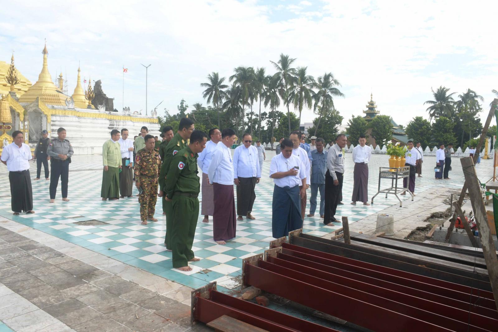 ဆက်လက်ပြီး ပြည်နယ်ဝန်ကြီးချုပ်နှင့်အဖွဲ့သည် လောကနန္ဒာ စေတီတော်မြတ်ကြီးရင်ပြင်တော်တွင် စိုက်ထူထားသည့် တံခွန်တိုင်အား ပြုပြင်နေမှုကို သွားရောက်ကြည့်ရှုစစ်ဆေးရာ ဆောက်လုပ်ရေးတာဝန်ခံက လုပ်ငန်းဆောင်ရွက်နေမှုနှင့် ဆက်လက်ဆောင်ရွက်ရမည့် အခြေအနေများကို ရှင်းလင်းတင်ပြသည်။ တင်ပြချက်များအပေါ် ပြည်နယ်အစိုးရအဖွဲ့ဝင်များက ဖြည့်စွက်အကြံပြုဆွေးနွေးတင်ပြကြရာ ပြည်နယ်ဝန်ကြီးချုပ်က လုပ်ငန်းများ အမြန်ဆုံးပြီးစီးနိုင်ရေးနှင့် သတ်မှတ်စံချိန်စံညွှန်းကိုက်ညီနိုင်ရေး လုပ်ဆောင်သွားရန်မှာကြားသည်။