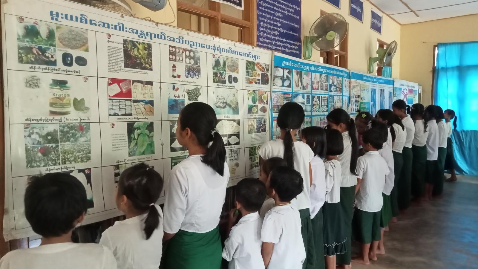 ထို့နောက် မူးယစ်ဆေးဝါးအန္တရာယ်နှင့်ပတ်သက်၍ အသိပညာပေးအကြောင်း အရာများကို အကျယ်တဝင့်သိရှိစေရေးအတွက် နံရံကပ်စာစောင်များပြသဆောင်ရွက်ထားမှုကို ကျောင်းသား/သူကလေးငယ်များက စိတ်ဝင်စားစွာကြည့်ရှု လေ့လာမှတ်သားခဲ့ကြောင်း သိရသည်။