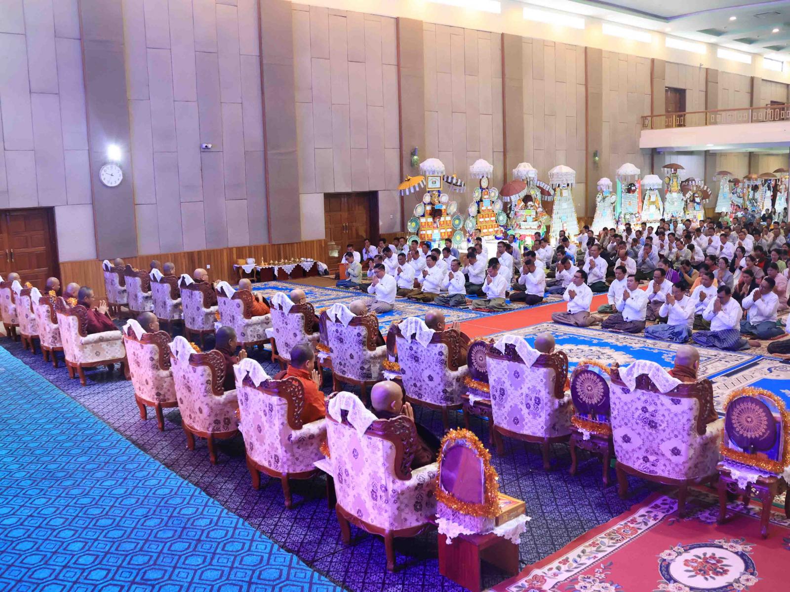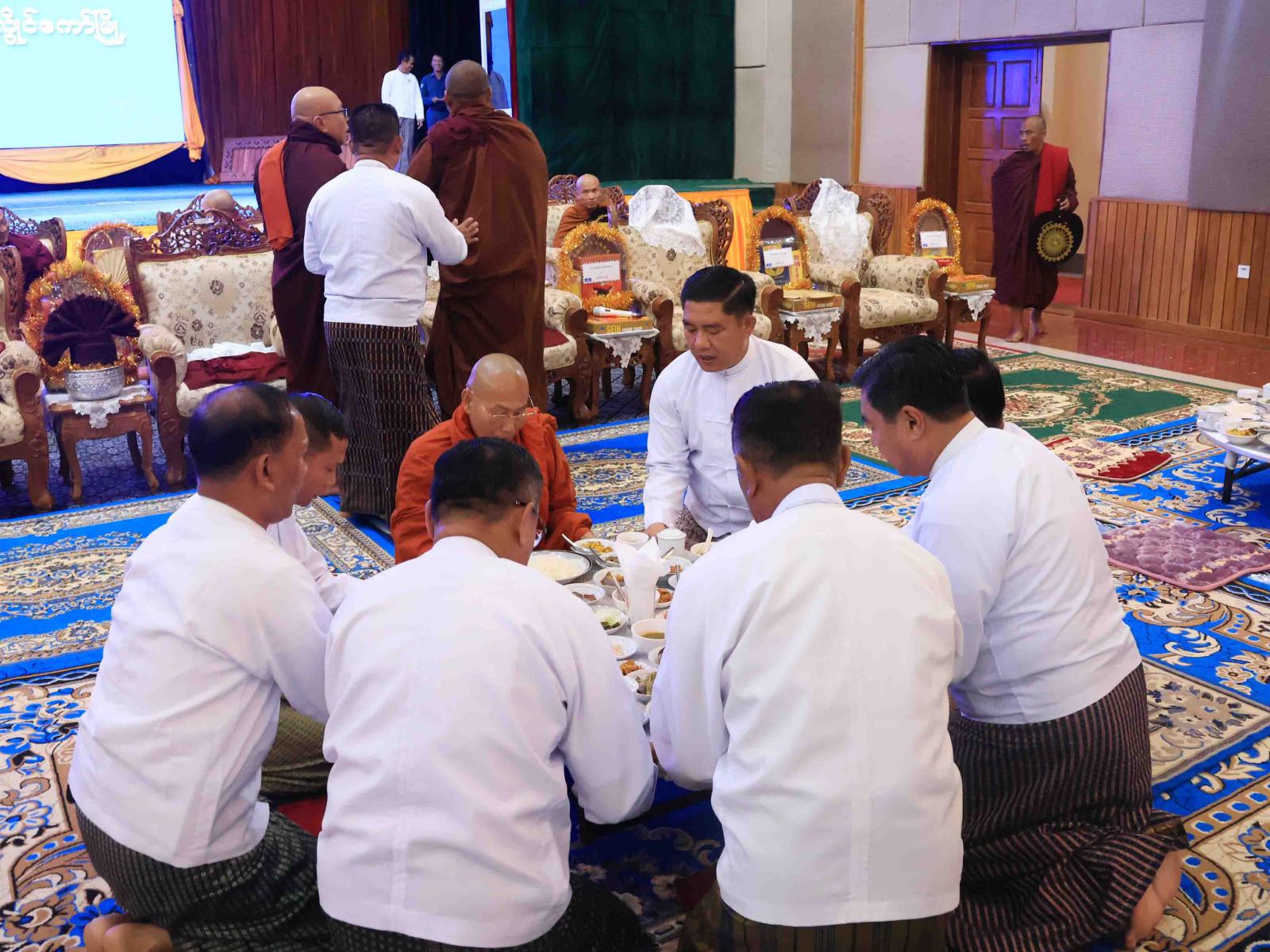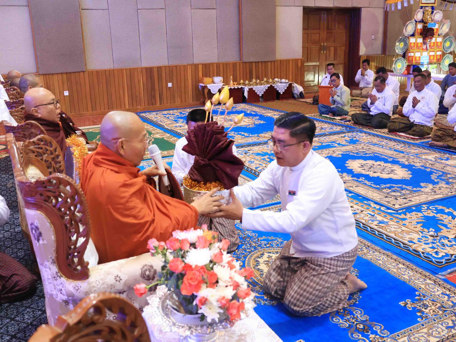 ထို့နောက် ပြည်နယ်သံဃနာယကအဖွဲ့ဥက္ကဋ္ဌ၊ ကျောင်းထိုင်ဘုန်းကြီးသင်တန်းကျောင်း ဆရာတော်အရှင်သူမြတ်ထံမှ အနုမောဒနာတရား နာကြား၍ ရေစက်သွန်းချအမျှပေးဝေခဲ့ပြီး “ဗုဒ္ဓ သာသနံစိရံတိဋ္ဌတု” သုံးကြိမ်ရွတ်ဆိုဆုတောင်းကာ ပြည်နယ်ဝန်ကြီးချုပ်နှင့် တာဝန်ရှိသူများက ဆရာတော်၊ သံဃာတော်အရှင်သူမြတ်များအား နေ့ဆွမ်းဆက်ကပ်လှူဒါန်းခဲ့ကြသည်။