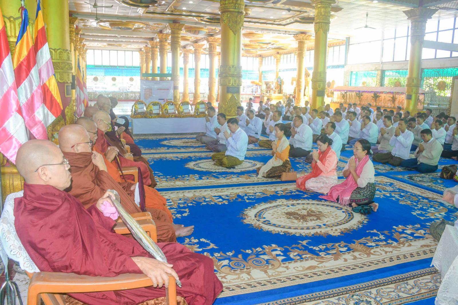 ဆက်လက်၍ မြို့နယ်ဩဝါဒါစရိယ၊ စစ်တွေမြို့၊ တပ်ဦးဆုတောင်းပြည့်ပရိယတ္တိစာသင်တိုက် ဆရာတော် အဂ္ဂမဟာသဒ္ဓမ္မဇောတိကဓဇ၊ အဂ္ဂမဟာဂန္ထဝါစကပဏ္ဍိတ ဘဒ္ဒန္တဉာဏဝံသ မဟာထေရ်မြတ်ထံမှ ပြည်နယ်ဝန်ကြီးချုပ်အမှူးပြုသော ဧည့်ပရိသတ်များက ငါးပါးသီလခံယူ ဆောက်တည်ကြပြီး သံဃာတော် အရှင်သူမြတ်တို့က ပရိတ်တရားတော်များကို ရွတ်ပွားချီးမြှင့်တော်မူကြသည်။