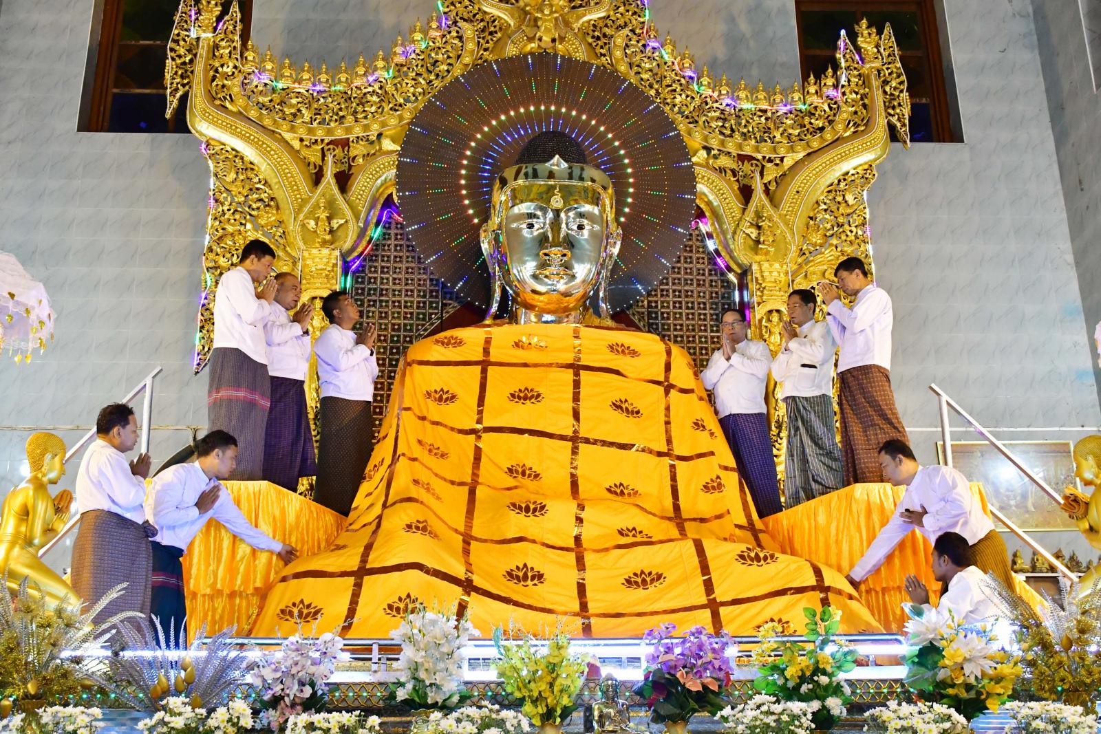 ထို့နောက် ပြည်နယ်ဝန်ကြီးချုပ်နှင့်အစိုးရအဖွဲ့ဝင်များက မသိုးသင်္ကန်းဆက်ကပ်လှူဒါန်းနိုင်ရေး ပြည်နယ်သံဃနာယကအဖွဲ့(မူလဒွါရ)အမိတာရာမရဲကျောင်းဆရာတော် အဂ္ဂမဟာဂန္တဝါစကပဏ္ဍိ တဘဒ္ဒန္တဂုဏလင်္ကာရကဗုဒ္ဓဿဒေမစသောဂါထာကို ရွတ်ဆိုတိုင်ကြားပေးပြီး ပြည်နယ်ဝန်ကြီးချုပ်နှင့်အစိုးရအဖွဲ့ဝင်များ၊ ဂေါပကအဖွဲ့နှင့် ဥပသကာတာဝန်ရှိသူများက သေဋ္ဌမာရ်အောင်ဘုရားကြီးအား မသိုးသင်္ကန်းဆက်ကပ်လှူဒါန်းကြရာ ဩဝါဒါစရိယ ဆရာတော်ကြီးများက ဇယေန္တောဗောဓိယာမူလေအစချီသော အောင်ဂါထာများကို ရွတ်ဖတ်ပူဇော်ပေးကြသည်။