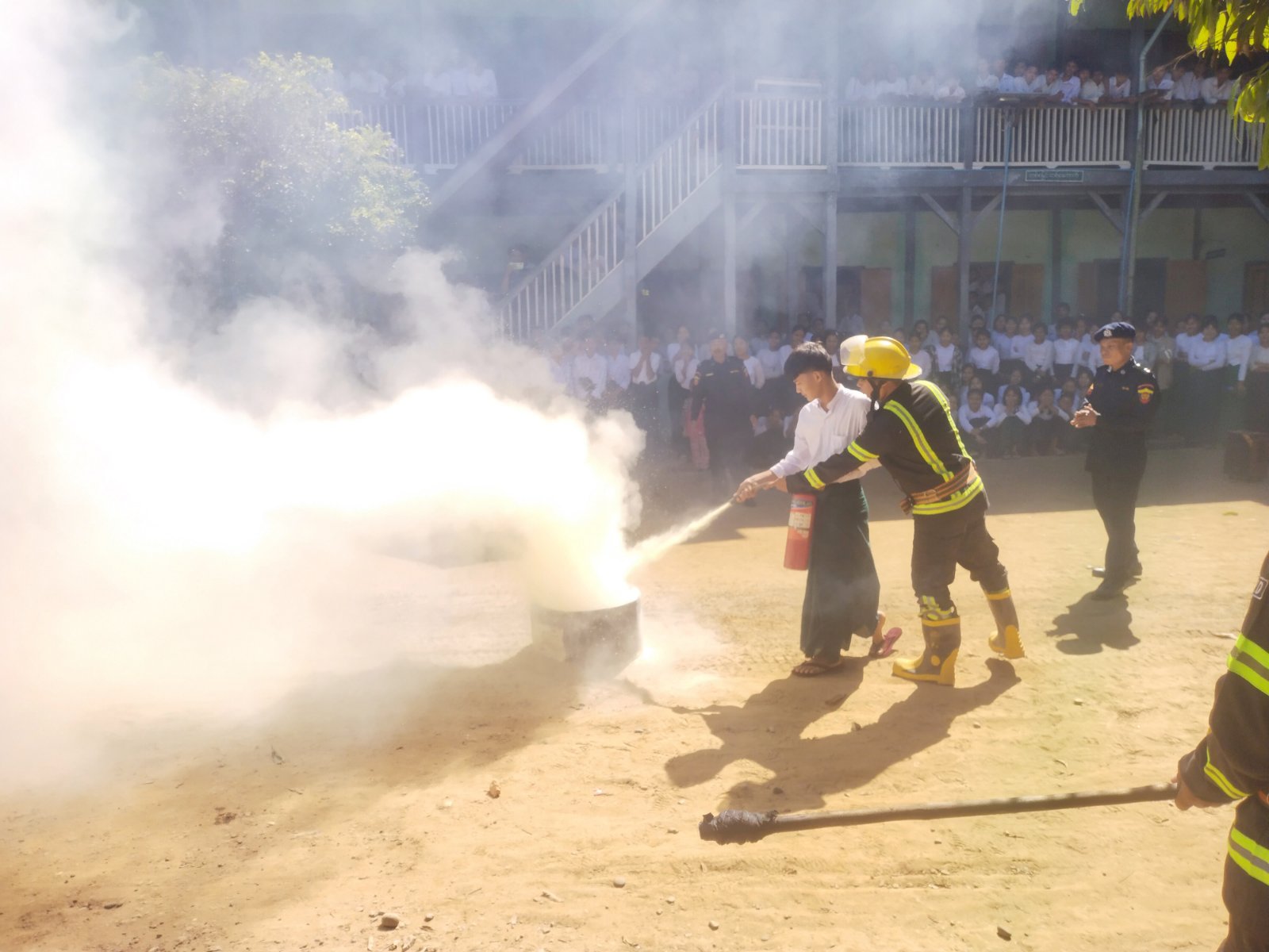 ရှေးဦးစွာ ဖာပွန်ခရိုင် မီးသတ်ဦးစီးဌာနမှ လက်ထောက်ညွှန်ကြားရေးမှူး ဦးကျော်ကျော်အောင်က မီးဘေးအန္တရာယ်ကြိုတင်ကာကွယ်နိုင်ရေးနှင့် မီးဘေးအန္တရာယ်ပေါ်ပေါက်လာပါက မီးသတ်ဆေးဗူးသုံးစွဲပြီး အလျင်အမြန် မီးငြိမ်းသတ်နိုင်ရေးအတွက် မီးသတ်ဆေးဗူးသုံးစွဲပုံ နည်းစနစ်များကို အသေးစိတ်ရှင်းလင်းပြောကြားသည်။ ထို့နောက် မီးသတ်တပ်ဖွဲ့ဝင်များက အသက်ကယ်ကြိုးကူးနည်းများကို လက်တွေ့သရုပ်ပြသကြပြီး အခြေခံပညာ ကျောင်းသား၊ ကျောင်းသူများက မီးငြိမ်းသတ်နည်းများကို ဇာတ်တိုက်လေ့ကျင့်သရုပ်ပြသခဲ့ကြသည်။